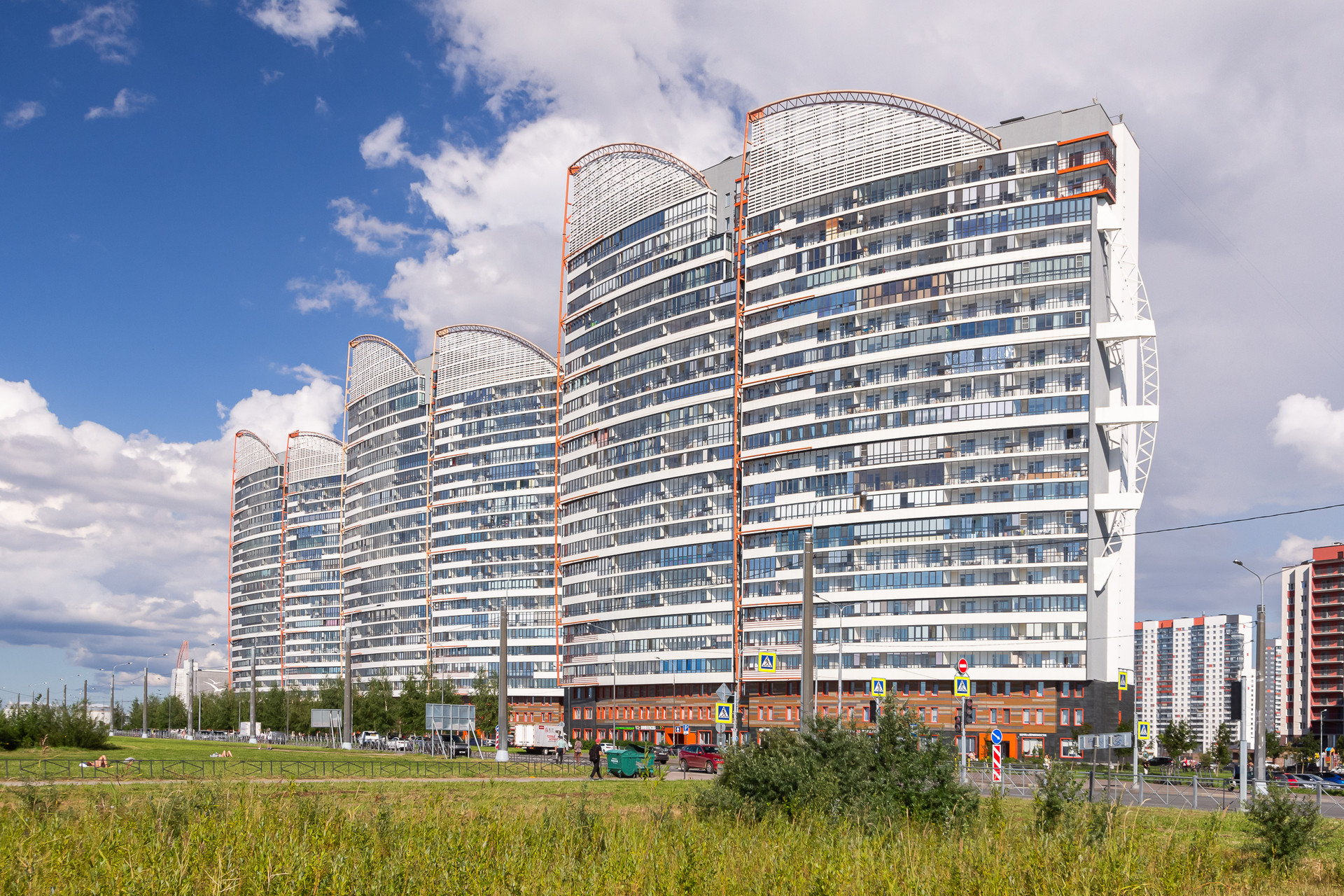 Жилой комплекс выполнен в виде огромных парусов, наполненных морским бризом. Дом расположен прямо на берегу Финского залива, в одном из самых зеленых и экологически чистых районов города.