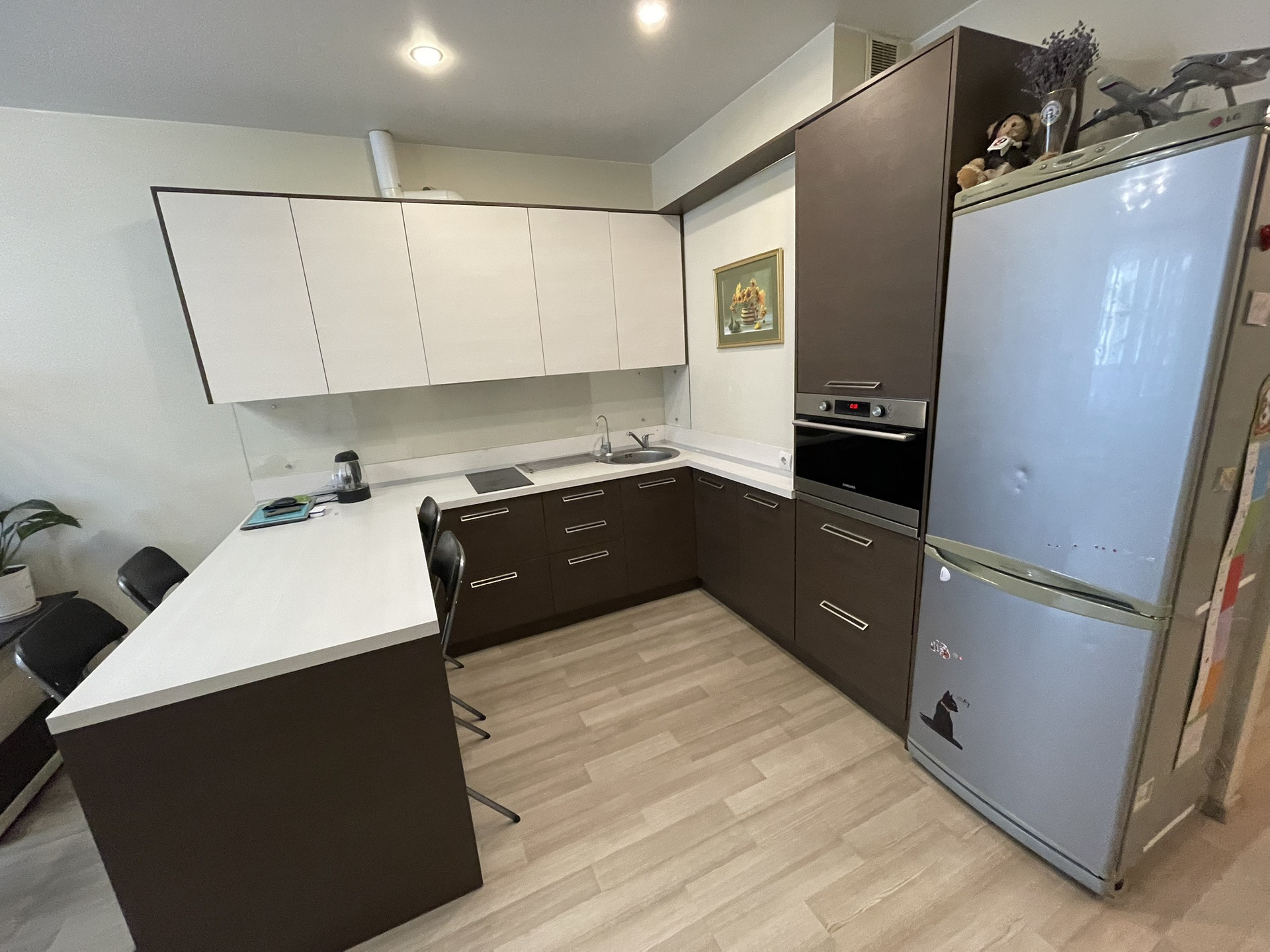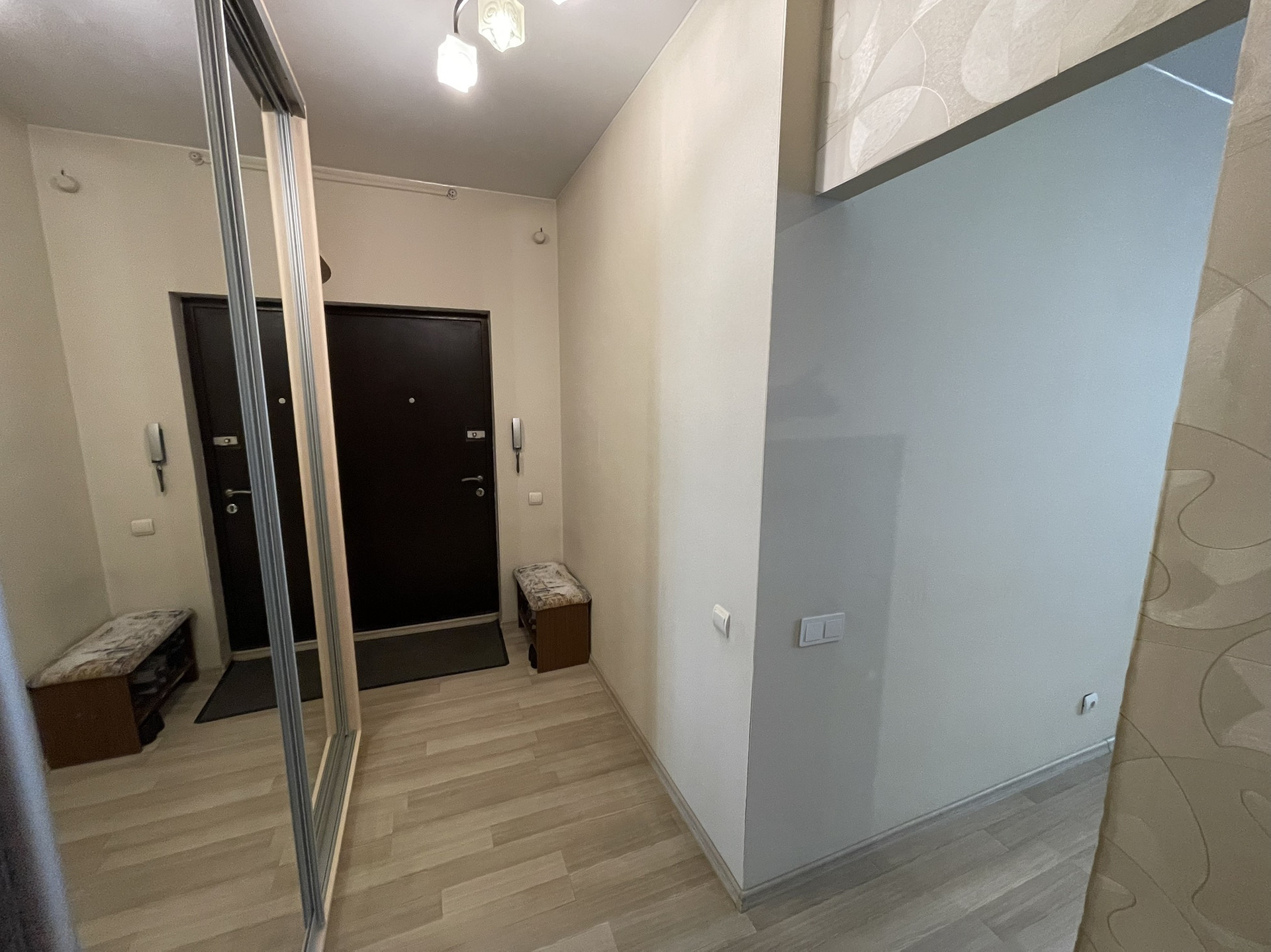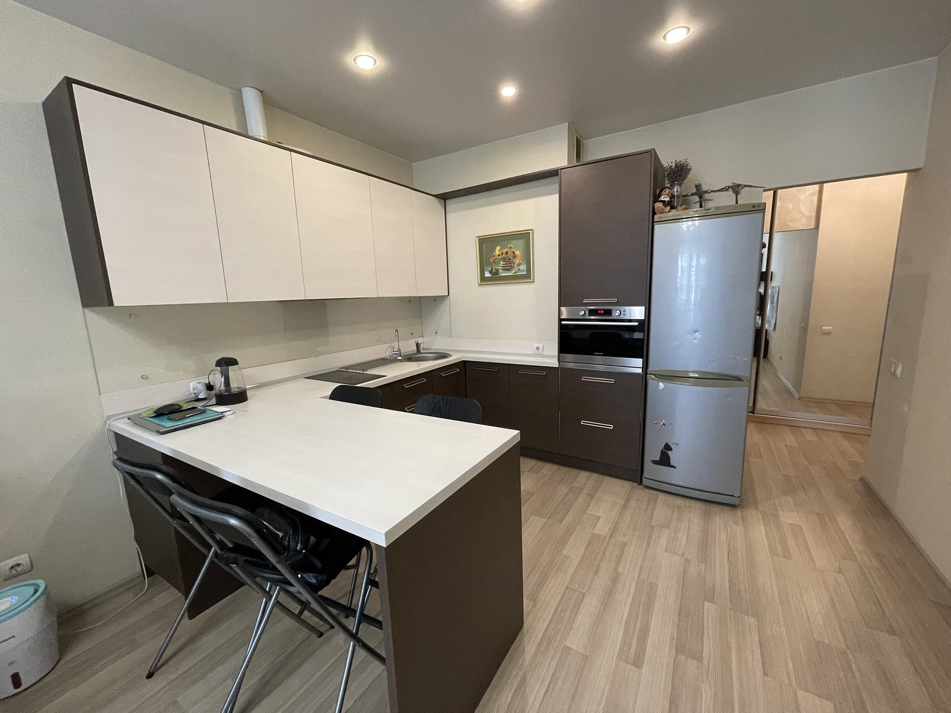 Кухонный гарнитур со встроенной техникой, холодильник остается. Диван и встроенный шкаф в коридоре тоже.