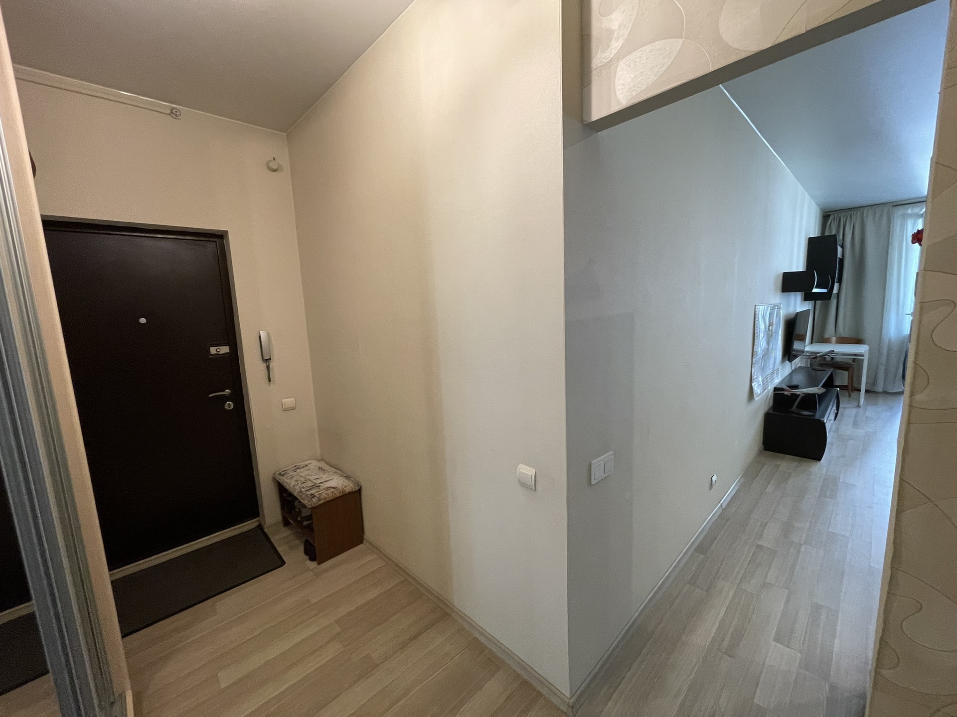 В комнате на полу ламинат. Потолки натяжные.