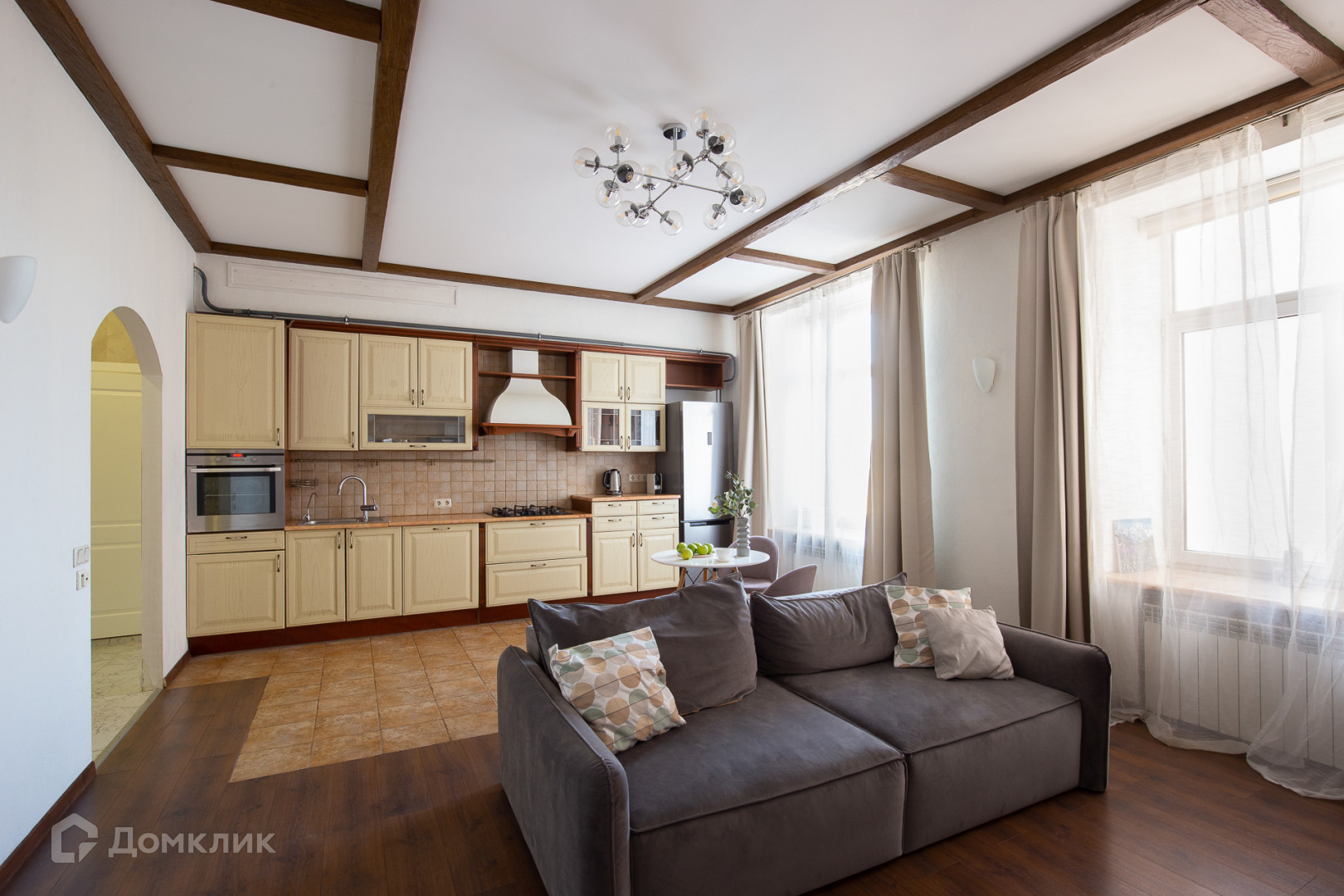 Большая кухня-гостиная позволит с комфортом готовить и размещать гостей в лаундж-зоне перед телевизором.