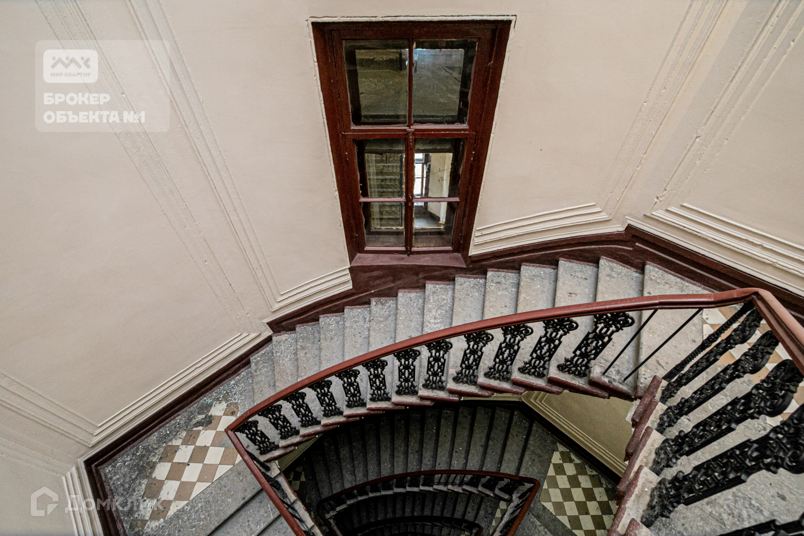 Квартира расположена на 5 этаже 5-и этажного дома, куда ведет старинная винтовая лестница, а лестничная площадка около квартиры имеет естественное освещение за счет купола.