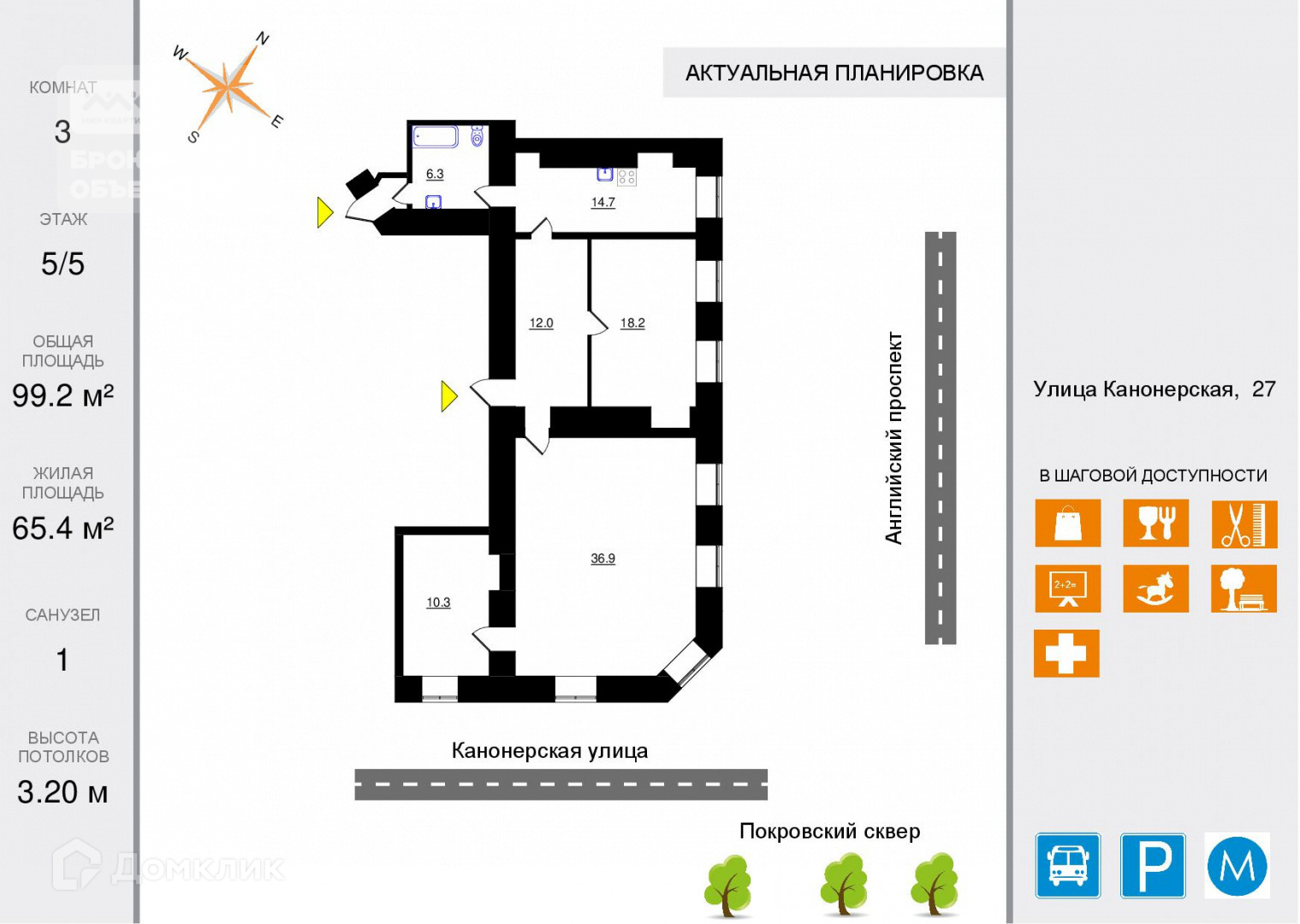 3-комнатная квартира, 99.2 м2, этаж 5 / 5, на продажу в Санкт-Петербурге, Канонерская улица, 27