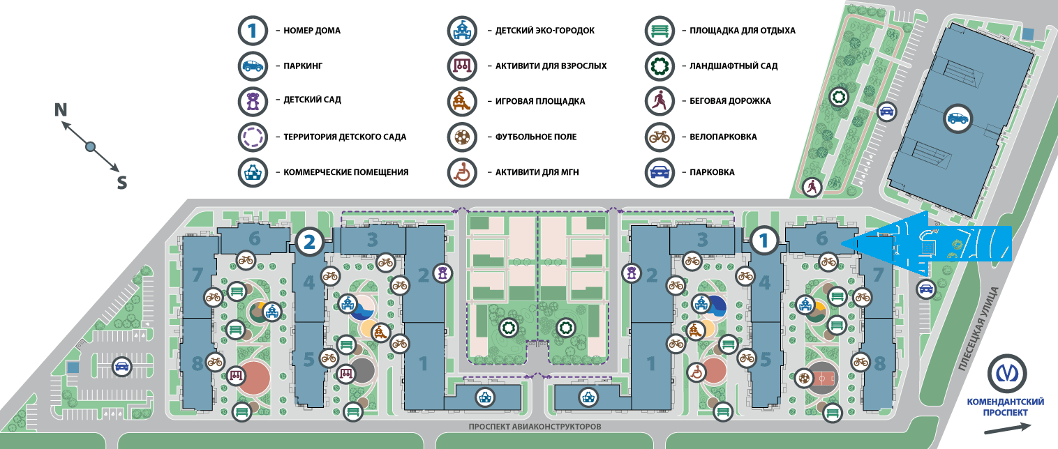 Во дворах - ландшафтный дизайн, видеонаблюдение, импортные детские площадки, зоны воркаут. Три детских сада на 420 мест и школа на 550 мест. Два многоуровневых паркинга на 880 м/м и гостевые парковки.