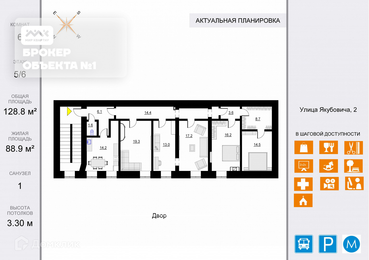 5-комнатная квартира, 128.8 м2, этаж 5 / 6, на продажу в Санкт-Петербурге, улица Якубовича, 2