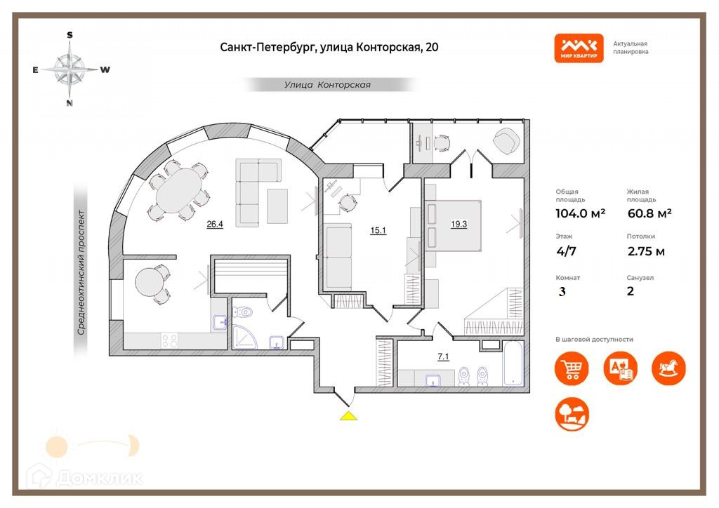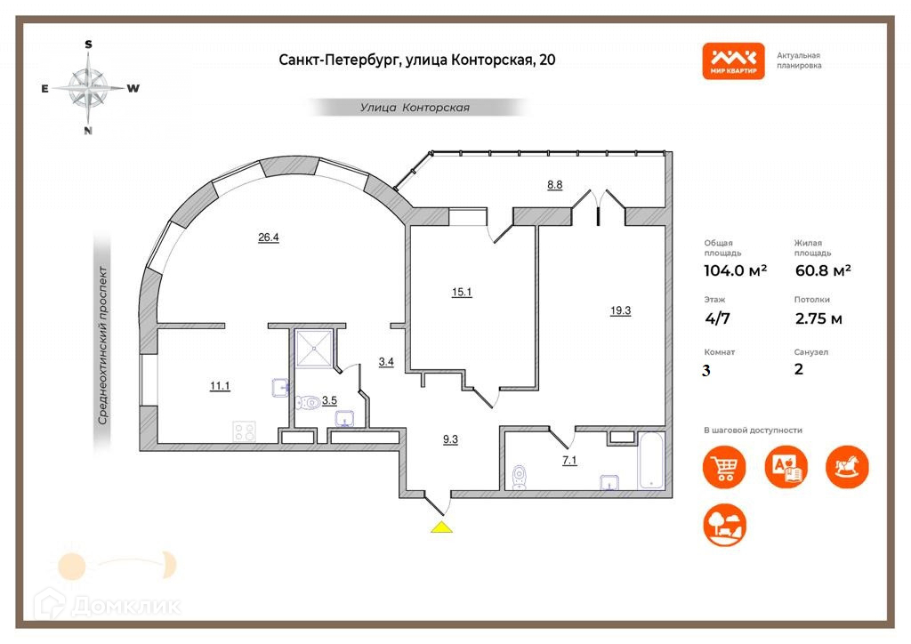 3-комнатная квартира, 104 м2, этаж 4 / 7, на продажу в Санкт-Петербурге, Конторская улица, 20