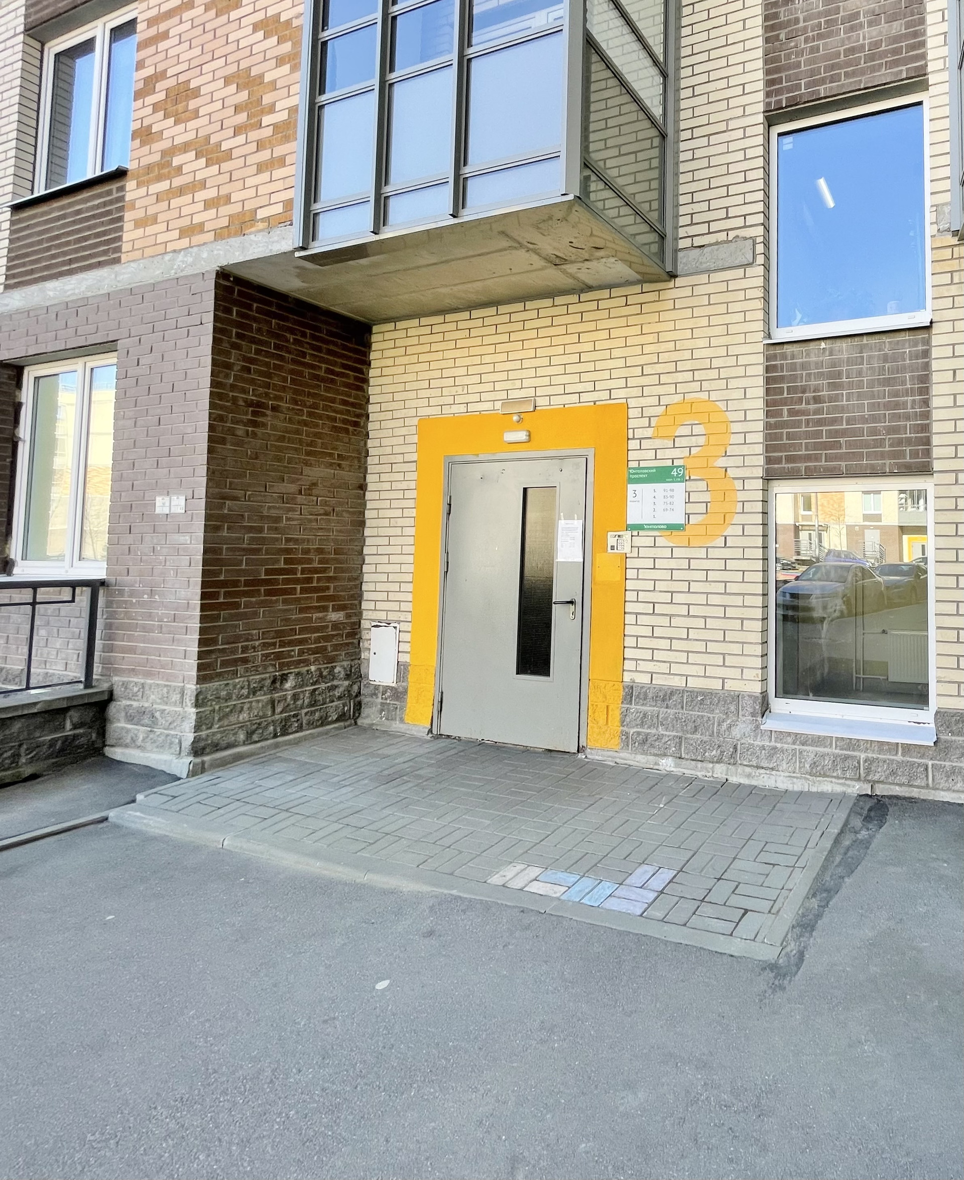 Дом оформлен кирпичом. Вход в парадную со двора. В парадной грузовой лифт и электрический пандус для колясок. Во дворе дома детская площадка.