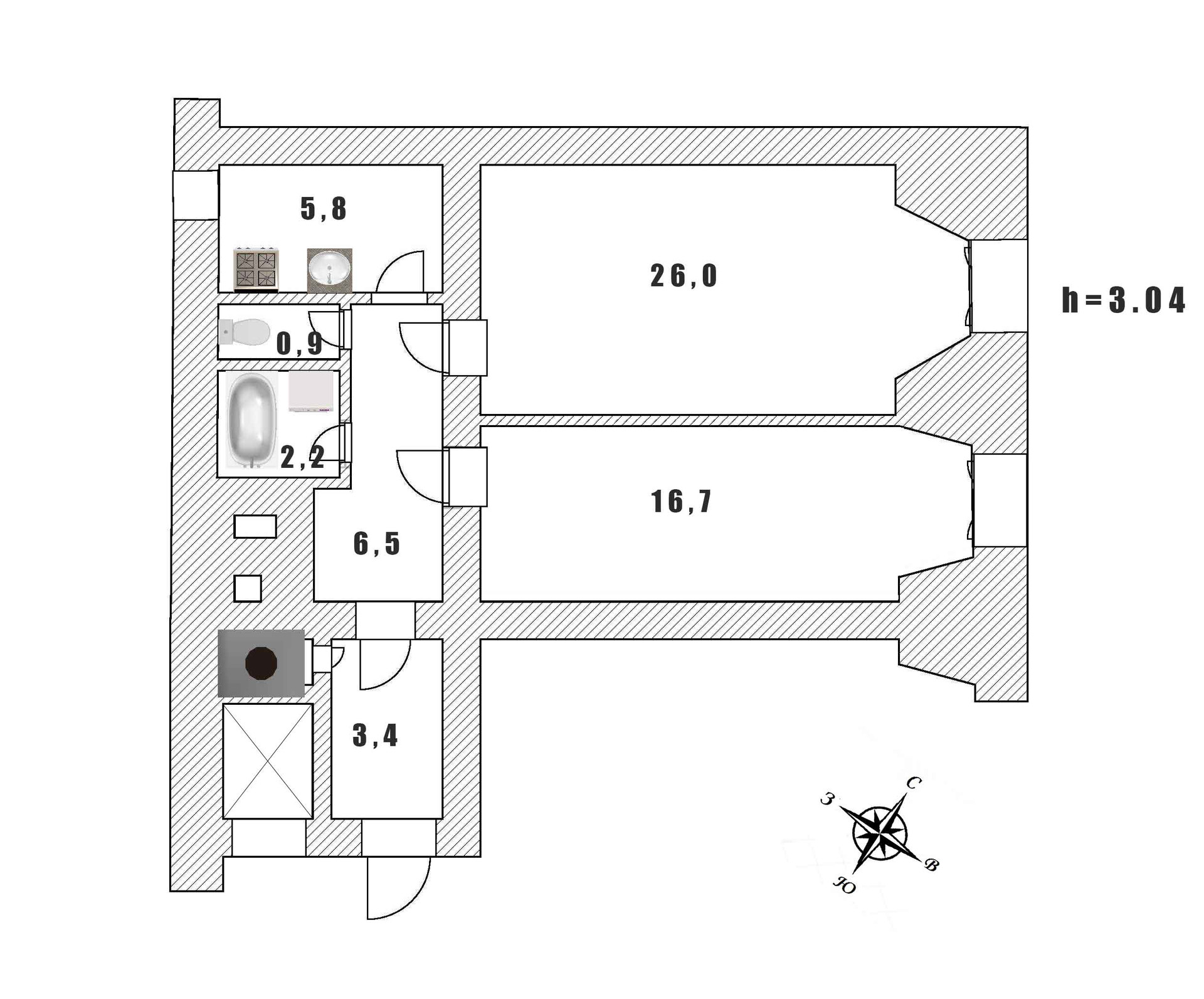 Высота потолков 3.04 м