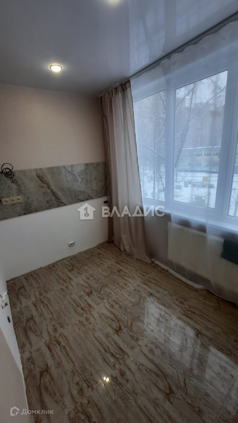 -в кухне выполнен фартук из керамогранита под мрамор над будущей рабочей поверхностью , выведены необходимые розетки.