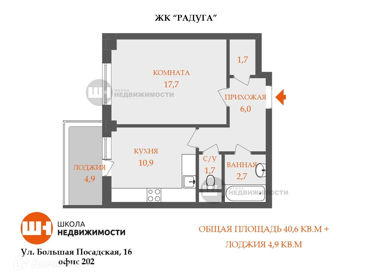 Общая площадь 40.6 м2