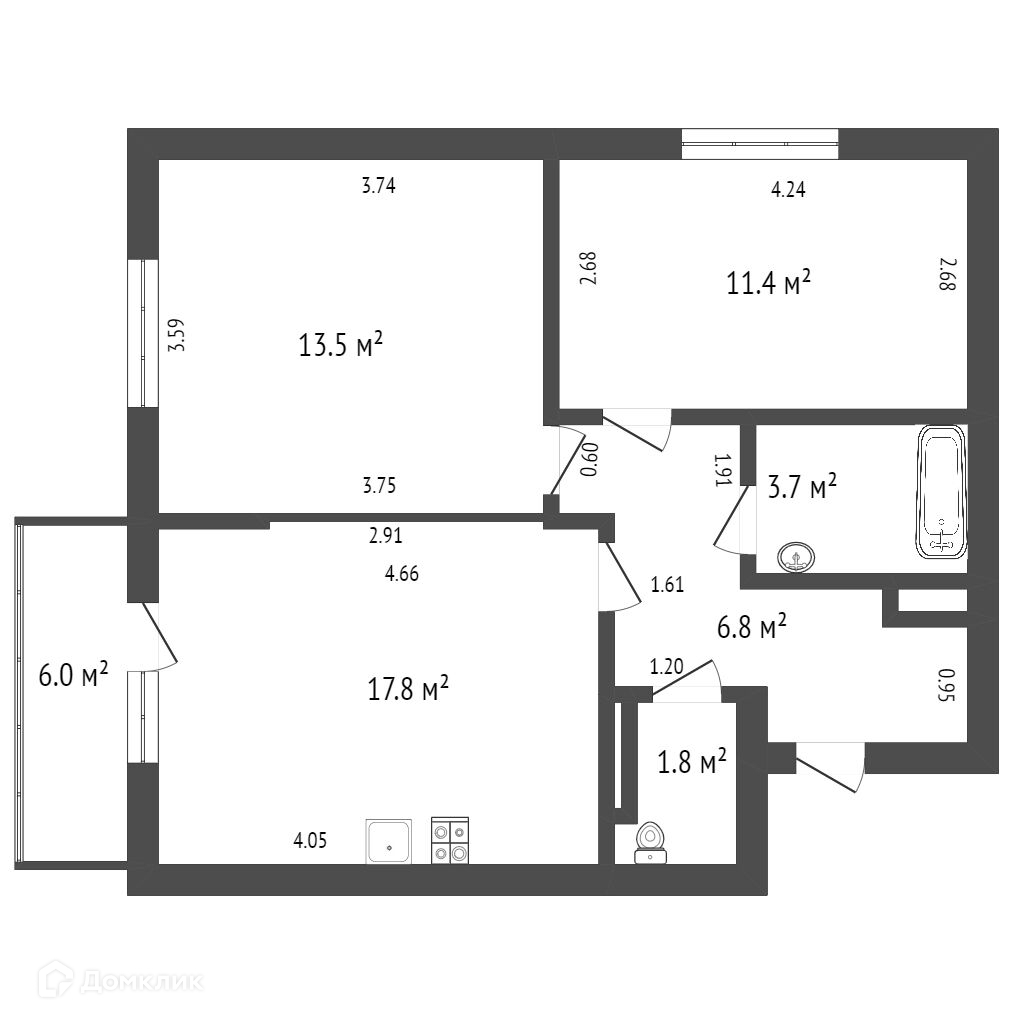 Действительно КОМФОРТНАЯ планировка, общая площадь 55м² БЕЗ УЧЕТА БАЛКОНА 6м², который выходит из просторной кухни-гостиной 17.8м², изолированные комнаты 13.5м² + 11.4м², сан.узел 1.8м², ванная комната 3.7м², коридор 6.8м² с местом для дополнительного хранения.