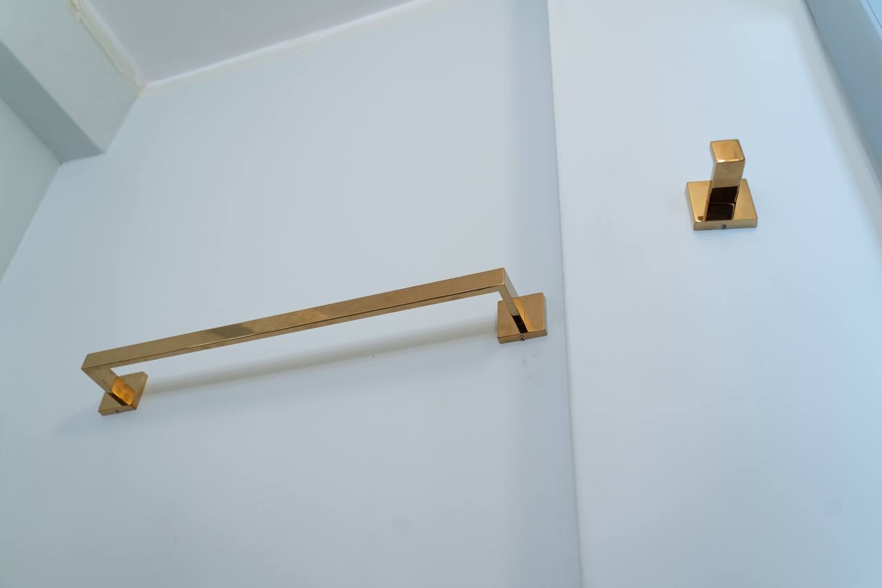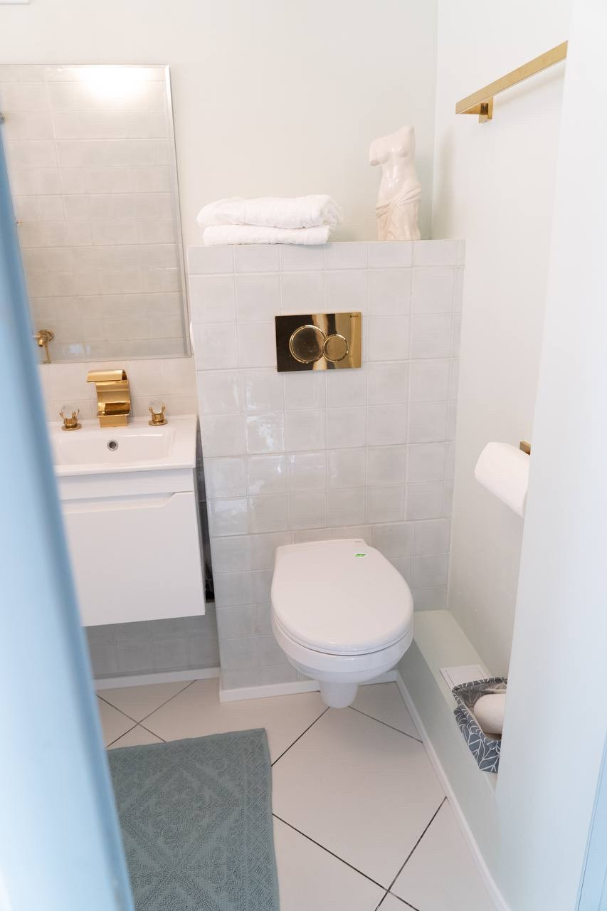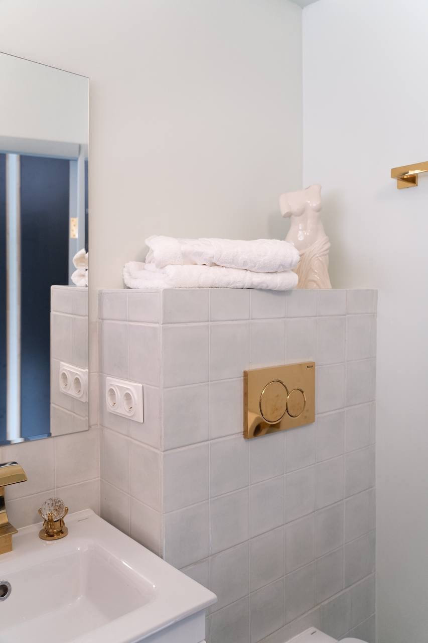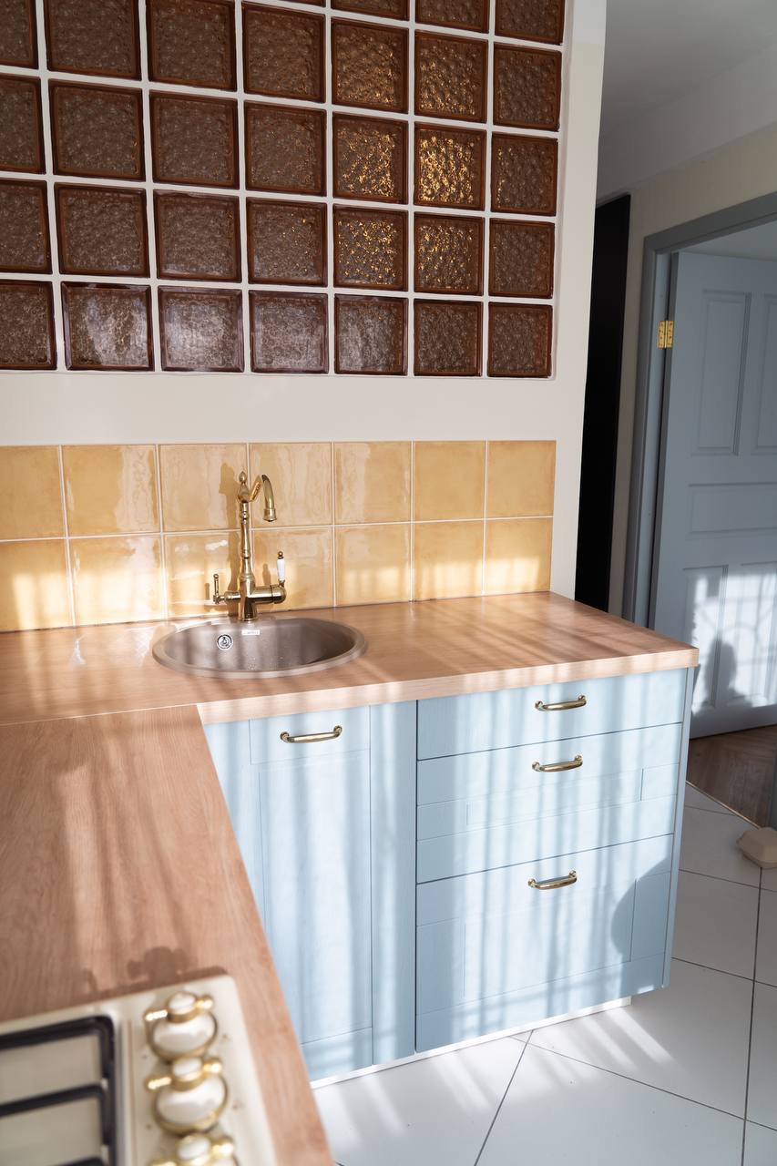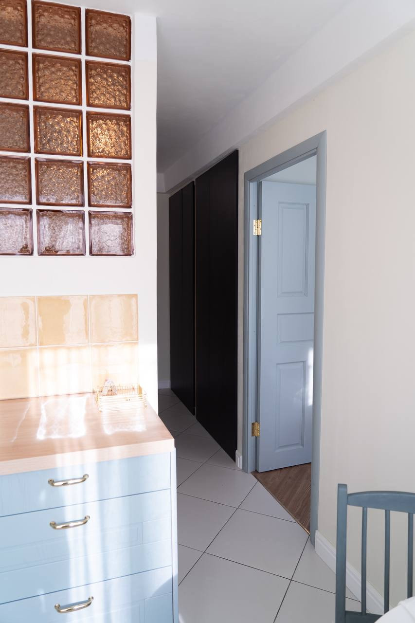 Изюминкой квартиры является стена, выполненная из стеклоблоков, которая визуально увеличивает пространство и пропускает в ванную комнату дневной свет.