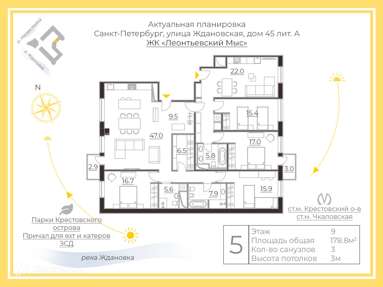 Большая семейная квартира имеет площадь 178,8 кв.м. и прекрасный функционал планировки,