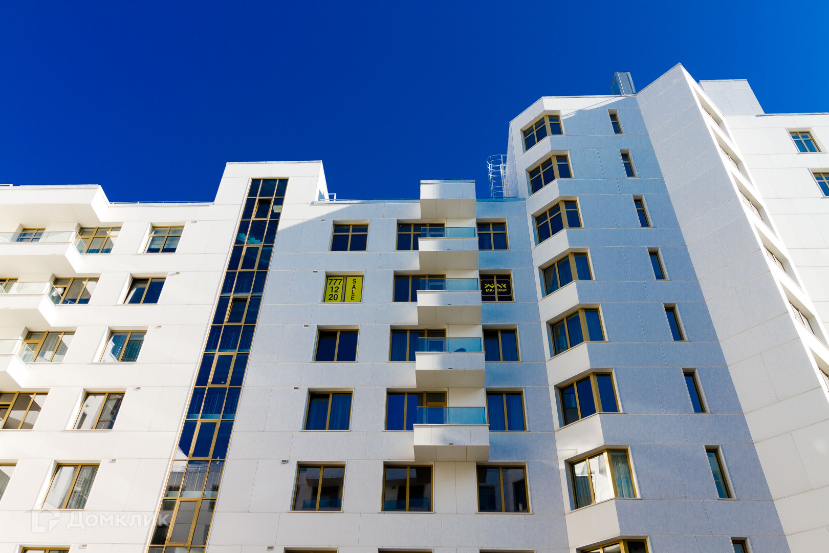 Светлый фасад дома, гармонично вписывается в окружающую зелень и своей формой напоминает круизный лайнер.