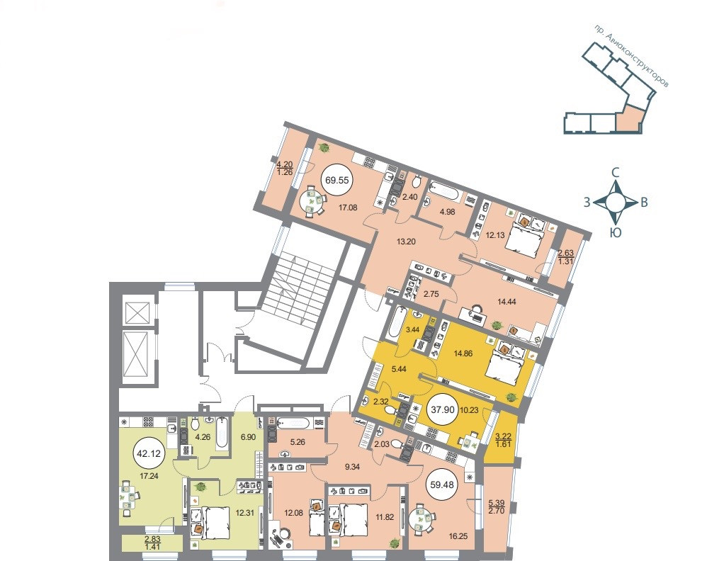 1-комнатная квартира, 37.9 м2, этаж 3 / 12, на продажу в Санкт-Петербурге, проспект Авиаконструкторов, 54