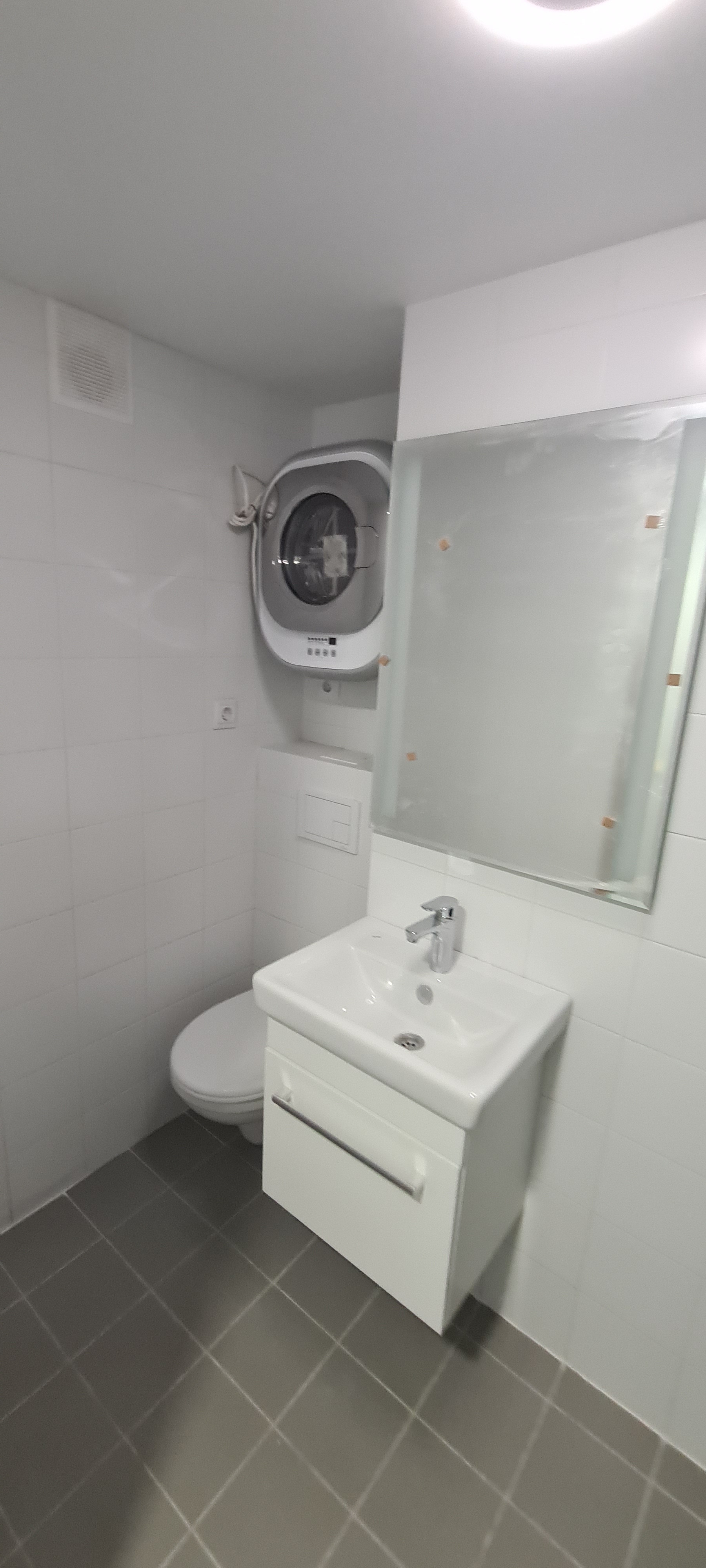В квартире сделан сан узел под ключ (инсталляция, стиральная машина, тропический и обычный душ, зеркало с подсветкой и раковина с тумбочкой).