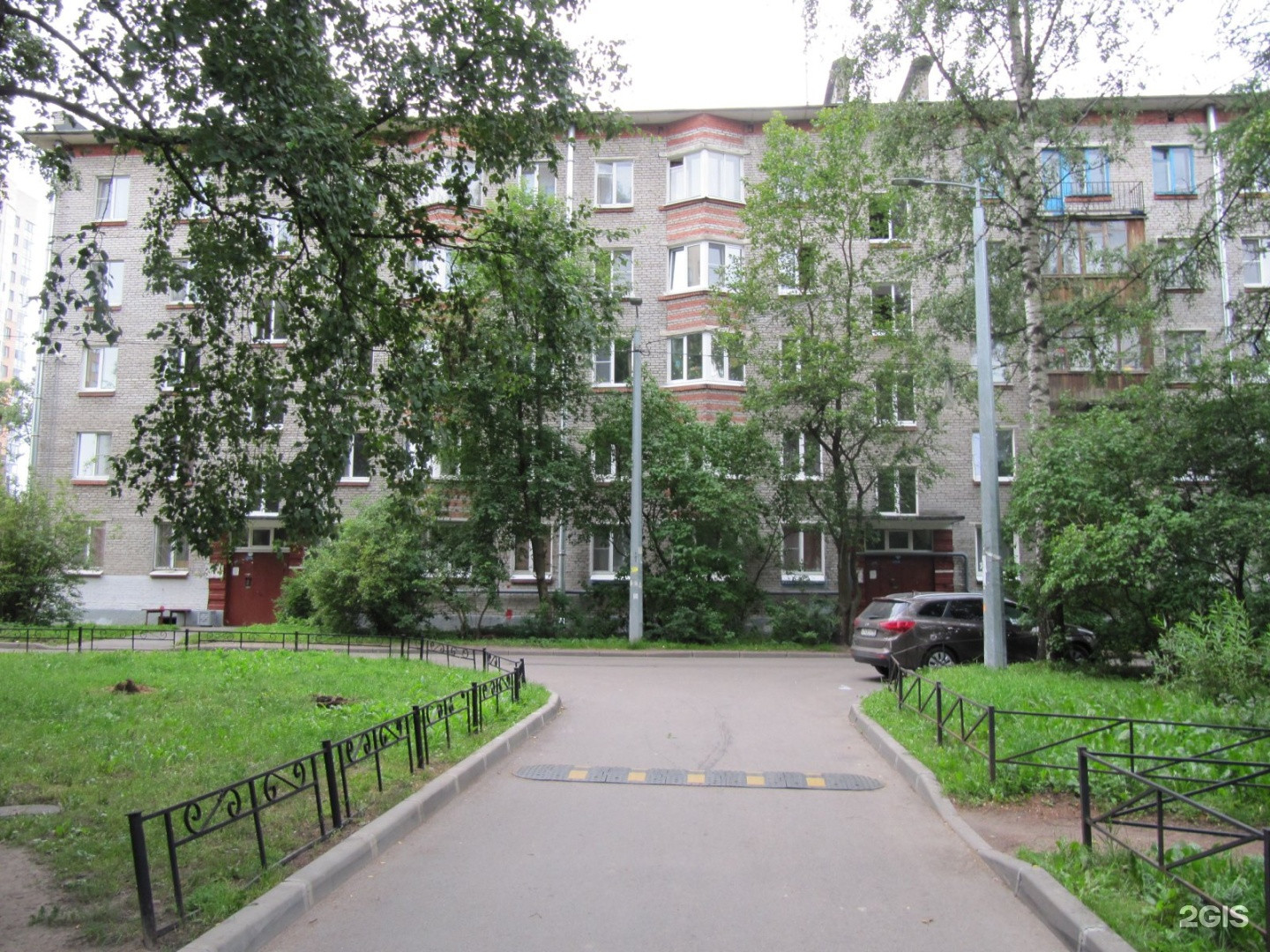 Дом расположен в глубине жилого квартала в окружении  зелени, деревьев и вдали от дороги.