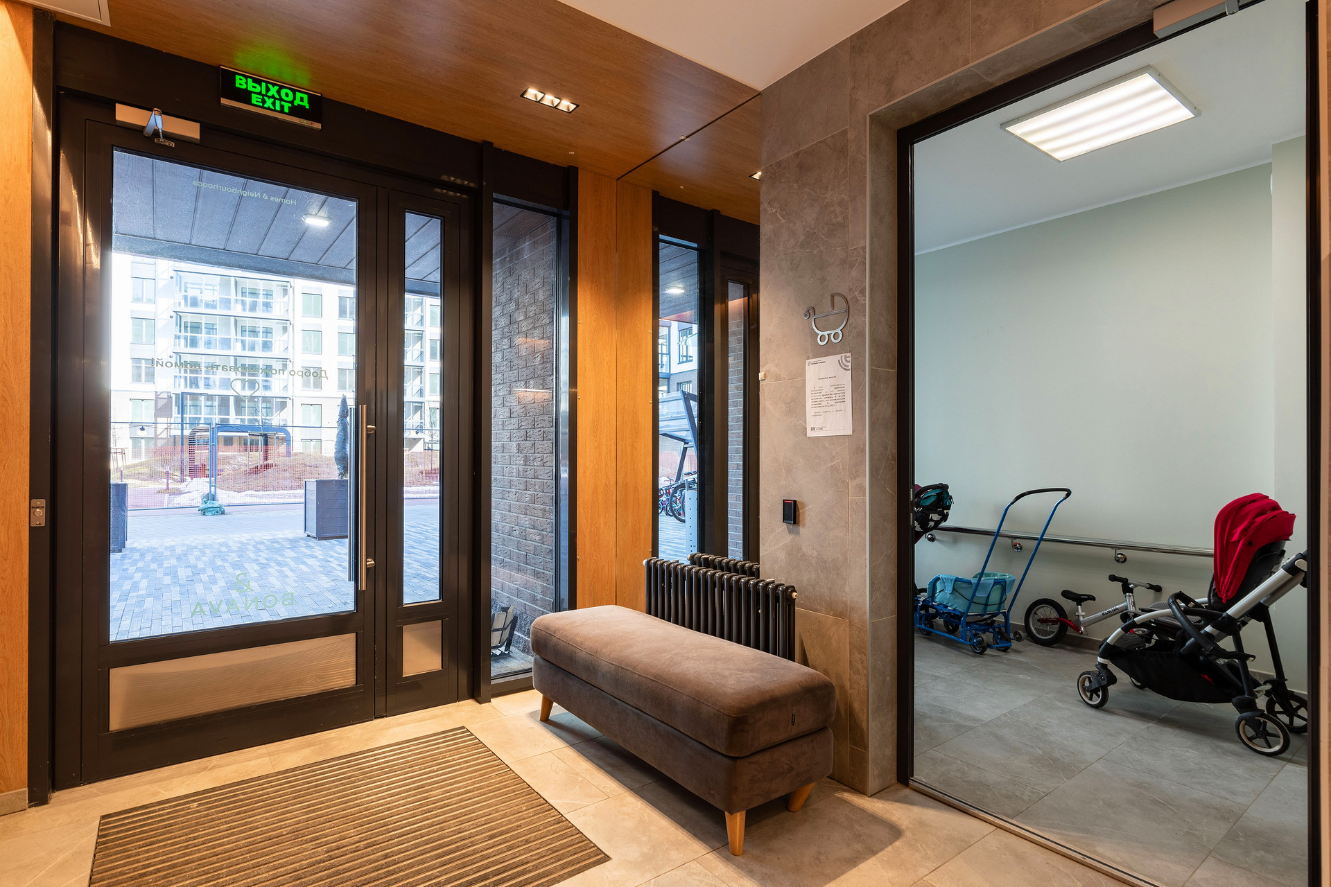 -презентабельная входная группа, продуманные места для хранения колясок и велосипедов