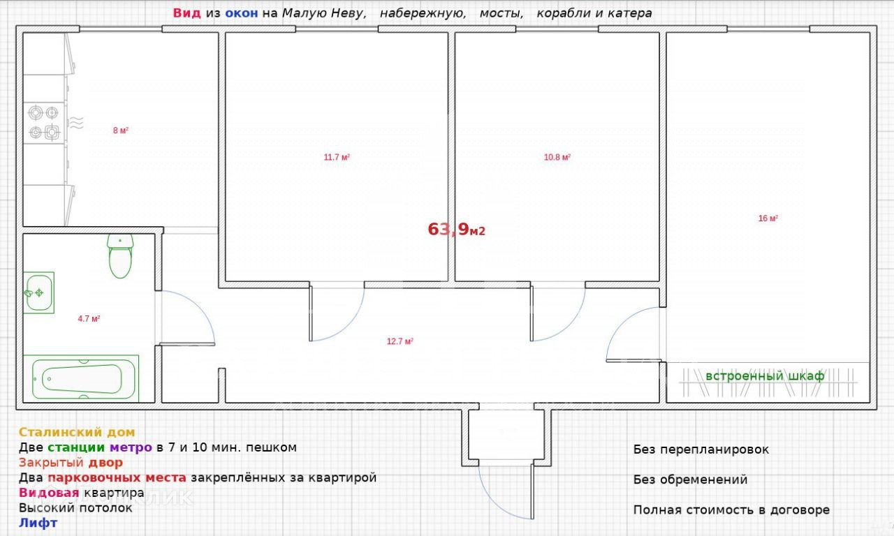Арт. 45092547 Предлагаем вашему вниманию трех комнатную квартиру наб. Макарова, 34 общей площадью 63,9 кв.м во одном из исторических районов который входит в топ районов Санкт Петербурга!