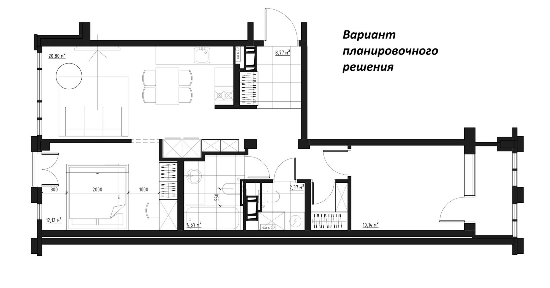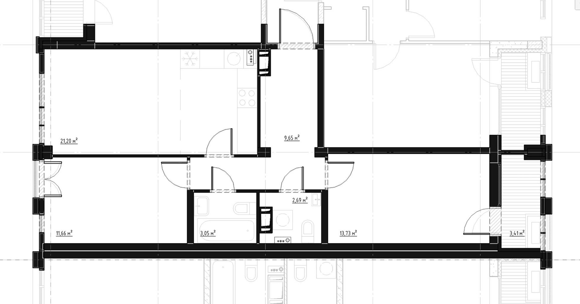 - двустороннее расположение спален, планировка в формате 3Е : большая кухня-гостиная 21м2;