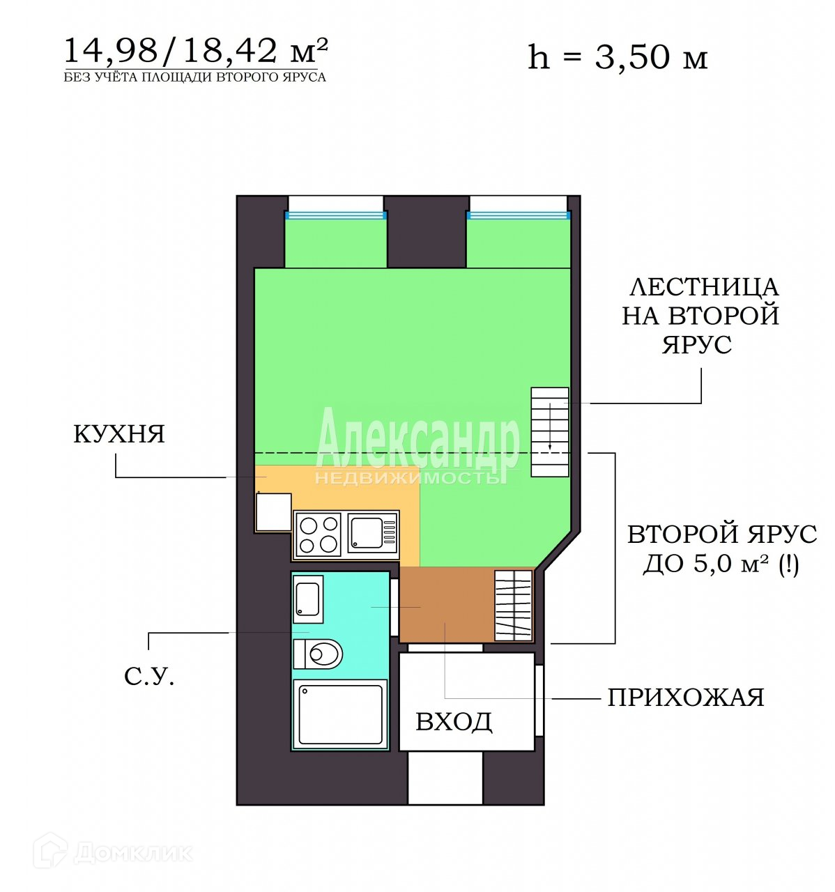 - ПЛОЩАДЬ: S = 14,98/18,42 м² (жилая по полу/с учётом второго яруса МАКСИМАЛЬНОГО размера – см. ПЛАН)