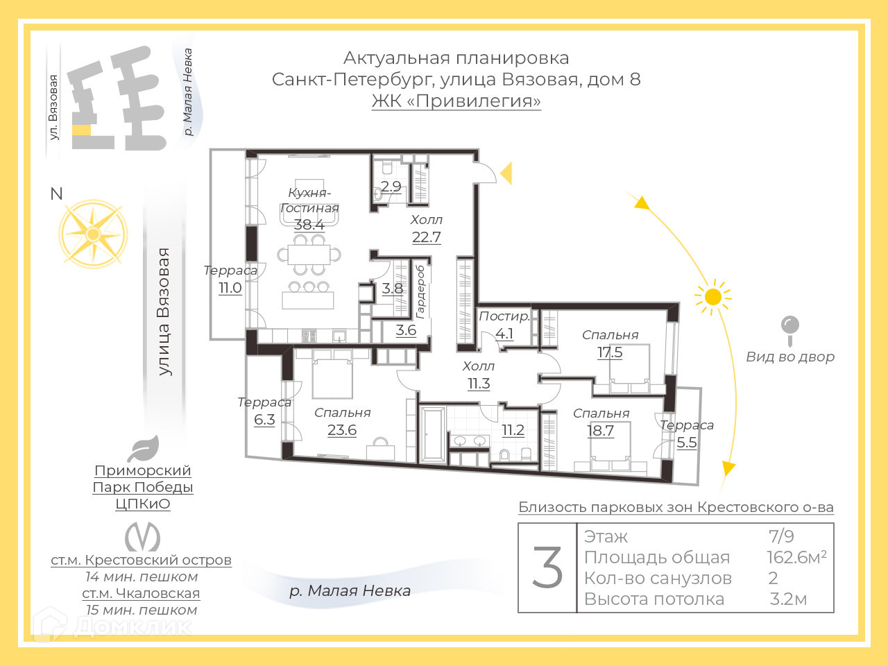 Арт. 43336939 Предлагается к продаже роскошная квартира, общей площадью 162,6 кв. м., с панорамным видом на Крестовский остров. Пространство квартиры эргономично и продумано до мельчайших деталей. Планировочное решение включает в себя: холл-прихожую 22,7 кв.м с тремя гардеробными, просторную кухню-гостиную, в которой имеется кладовая комната 3,8 кв.м, а так же выход на видовую террасу 11 кв.м, гостевой санузел, хозяйскую спальню 23,8 кв.м. с выходом на видовую террасу, спальню 18,7 кв.м с выходом на террасу во внутренний двор, детскую спальню площадью 17,5 кв.м, второй санузел, прачечную. В отделке квартиры использованы дорогостоящие натуральные материалы: мебель производства Италии, кухня укомплектована техникой Miele, полы выложены мрамором и паркетом от итальянского производителя. В квартире очень уютно и спокойно!