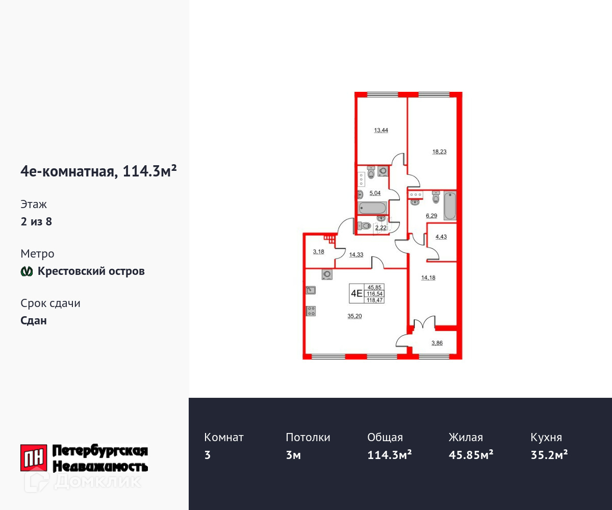 3-комнатная квартира, 114.3 м2, этаж 2 / 9, на продажу в Санкт-Петербурге