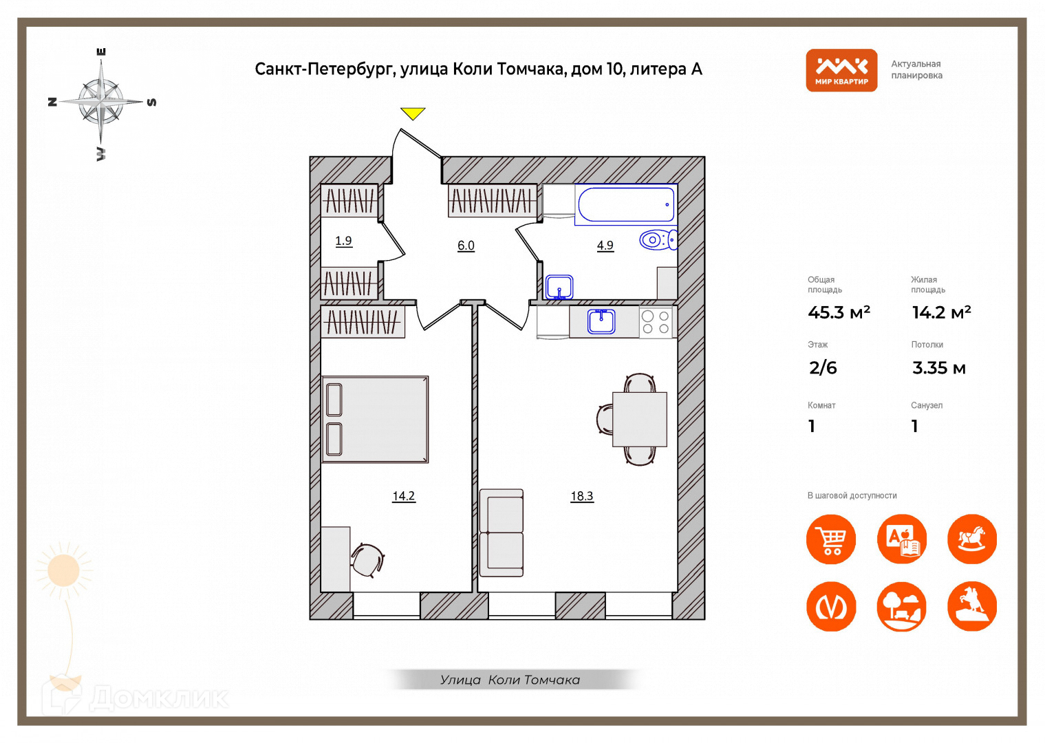 1-комнатная квартира, 45.3 м2, этаж 2 / 6, на продажу в Санкт-Петербурге, улица Коли Томчака, 10