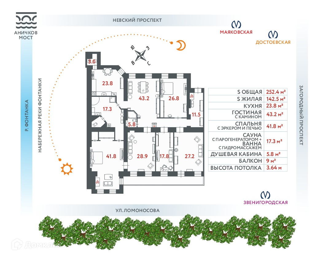 Прекрасная инфраструктура: школы, детские сады, магазины, поликлиники, театры и музеи - все в пешей доступности. Школы №195, №308, №122, №550, ТТиШБ (частная школа), ГУЦ, Лицей №211. Дет. Сады №135, №19 Чебурашки, №250. Школа йоги Up Space, большая спортивная площадка, детская площадка Шахматный Дворик, Школа искусств им. П.А.Серебрякова, Театрально-цирковое образовательное учреждение Свобода Слова, школа танцев Salsa Social, школа танцев Визит, Институт развития образования (центр повышения квалификации.Во Дворе cовременный театр кукол Karlsson Haus вторая сцена. Екатерининский сквер, Сад Аничкова Дворца, Аничков Дворец, Семеновский сквер, Бунинский сквер, сквер Маневича, сквер Эдуарда Хиля, сад Дома Дубянских в радиусе 1 км. Let’s Swim (спортивный зал, бассейн) 660м – 7 мин.