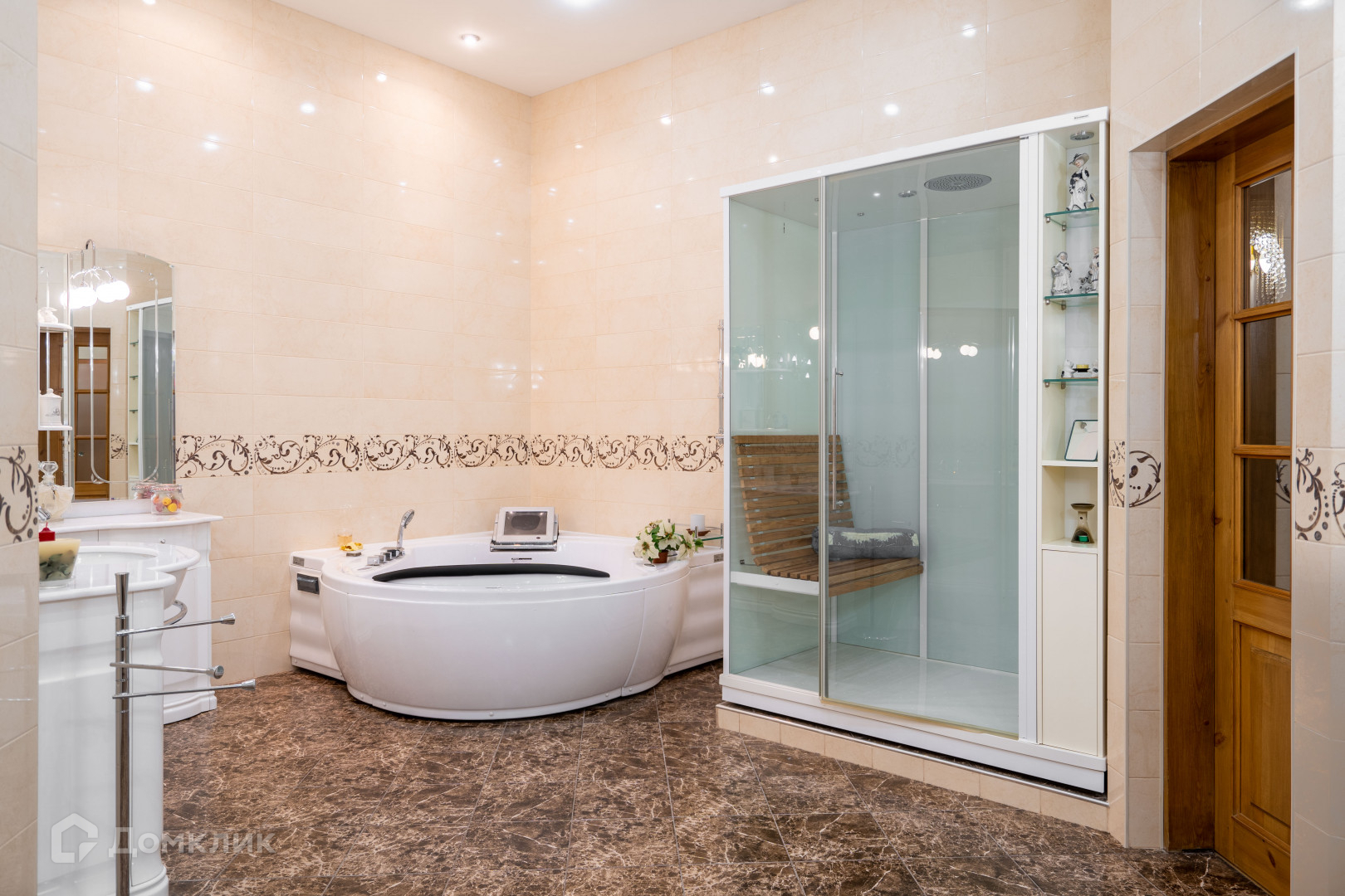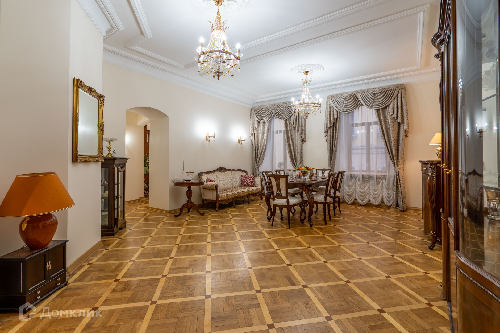 Квартира площадью 252,4 кв.м., кухня столовая гостиная с встроенной итальянской кухней OLD STYLE фабрики L’ OTTOCTNTO с встроенной техникой, гостиная с камином , роскошная спальня с эркером, камином , с тремя окнами, комната с выходом на террасу, рабочий кабинет, музыкальная гостиная, детская комната. В комнатах по два окна, много света высокие потолки 3.64 м. с лепниной, окна выходят на улицу и во двор. В квартире два санузла, большой санузел 17,3 кв.м, с ванной Appollo AT-9019 183 см. с гидромассажем , с сауной Svedbergs S-Box De Lux душевой кабиной с парогенератором 150 на 90, второй санузел с системой тропический душ.