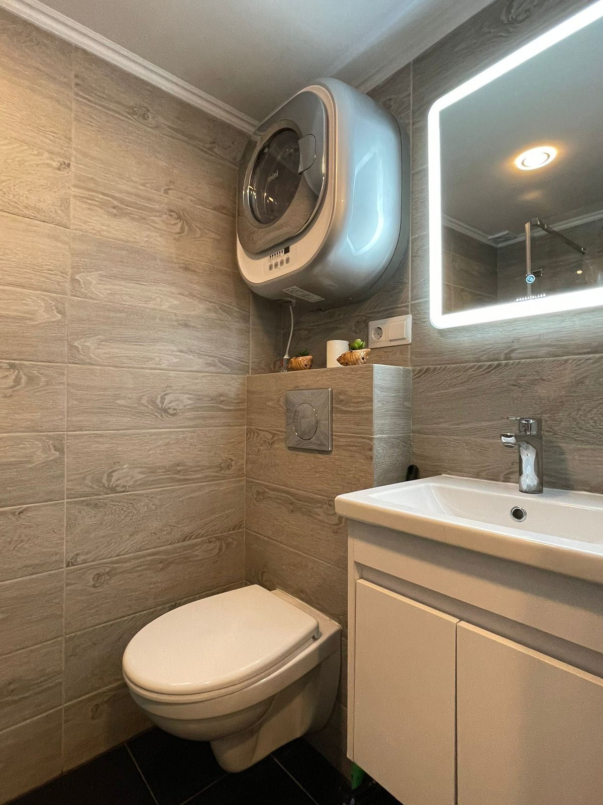В квартире сделан сан узел под ключ (инсталляция, стиральная машина, тропический и обычный душ, зеркало с подсветкой и раковина с тумбочкой).