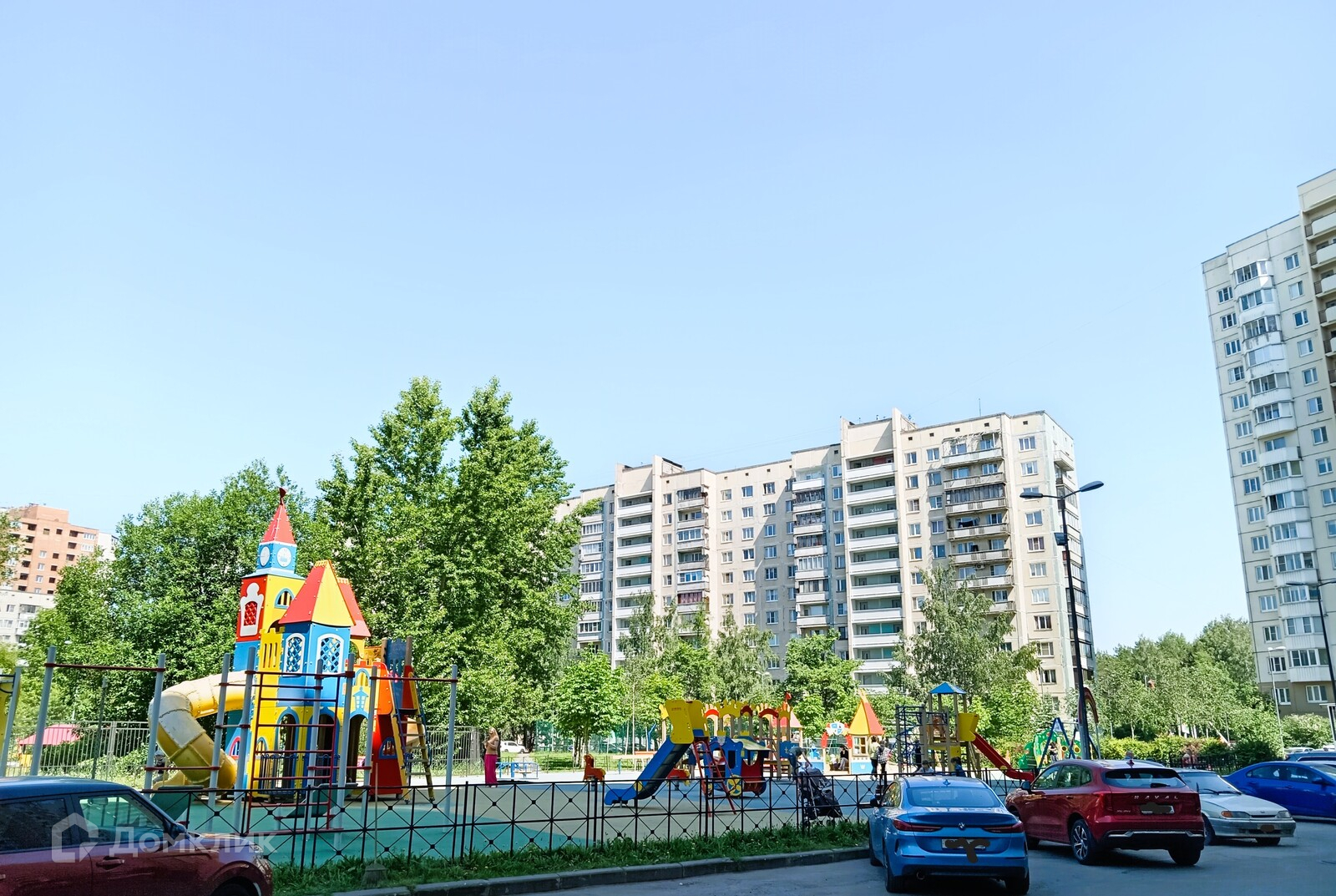 про двор - зеленый, просторный, почти закрытый, всегда место для авто, детские площадки, в глубине дворов детсад, далее , по соседству школа, рядом детская и чуть дальше взрослая поликлиники, удобный выезд на КАД, муниципальный транспорт очень активно работает, можно без пересадок проехать в центр, на ВО, далее везде,
