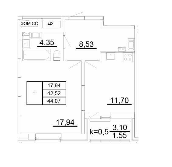Общая площадь 44.07 м2