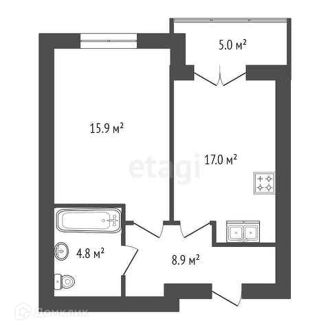 Общая площадь 51 кв.м., жилая 15.9 кв.м., кухня 17 кв.м.