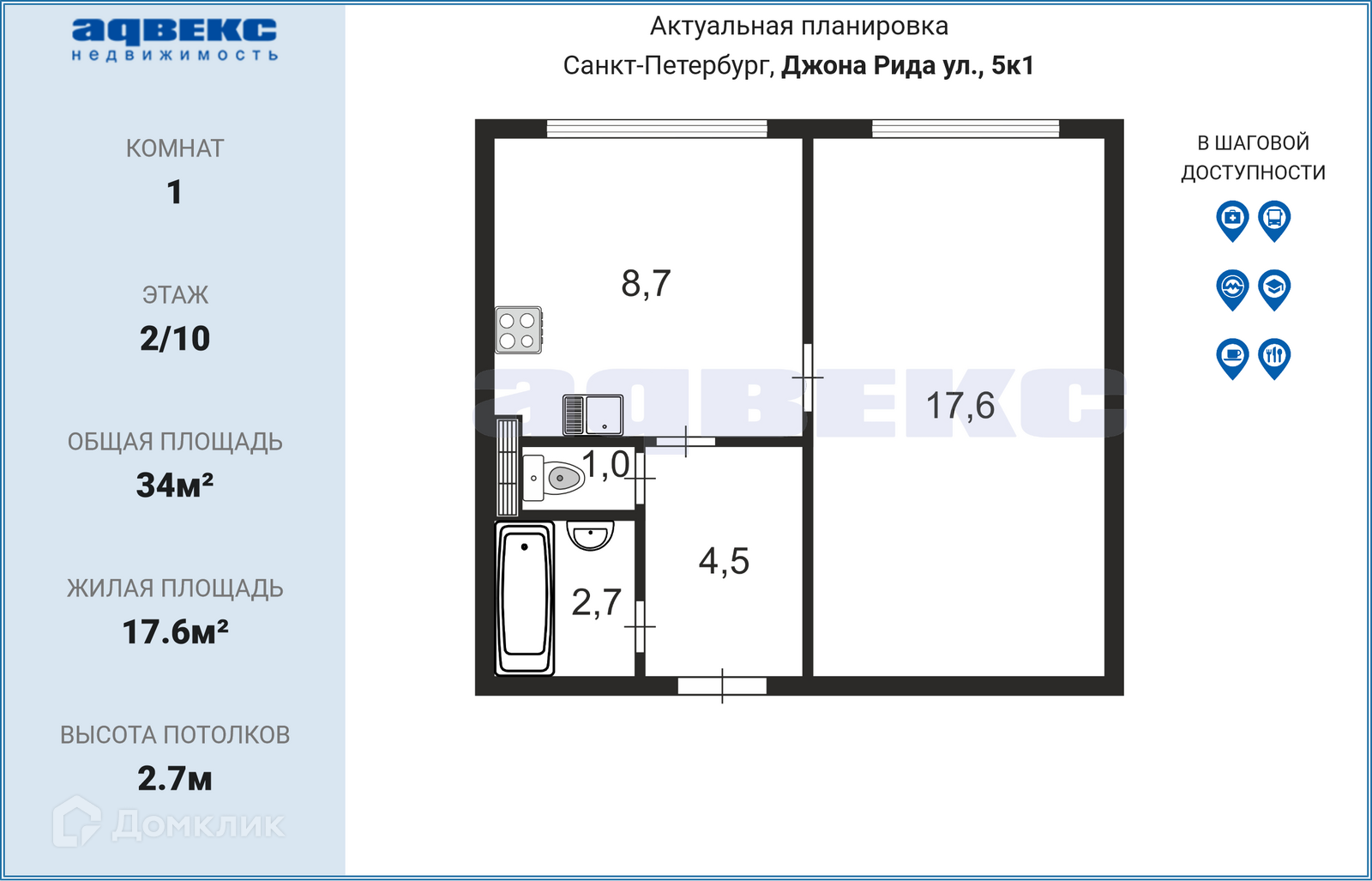 Общая площадь 34 м2