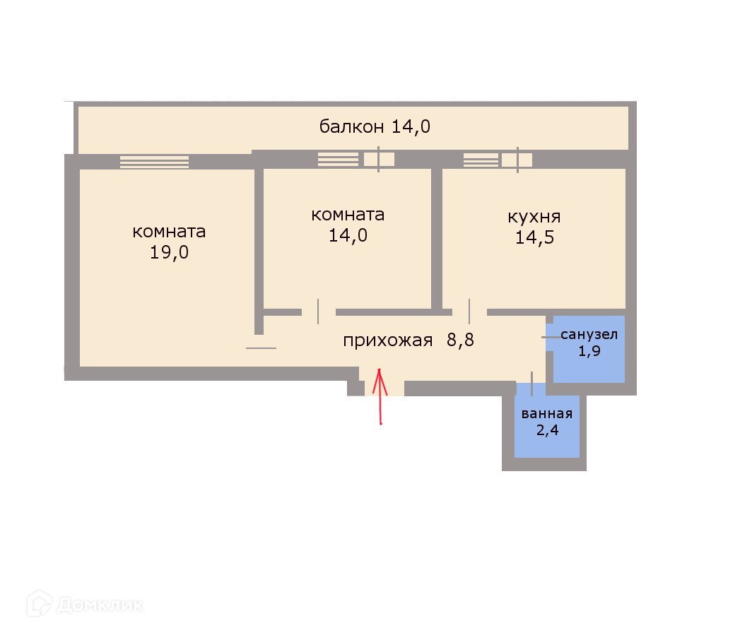 Ищите квартиру с большим балконом? Предлагаем квартиру, состоящую из двух комнат 19+14 с кухней 14,5 кв м, из которой есть выход на огромный балкон  площадью 14,2 кв м, на него можно выйти с маленькой комнаты.