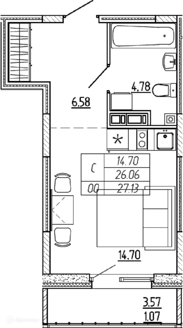 Балкон, лоджия 1 балкон
