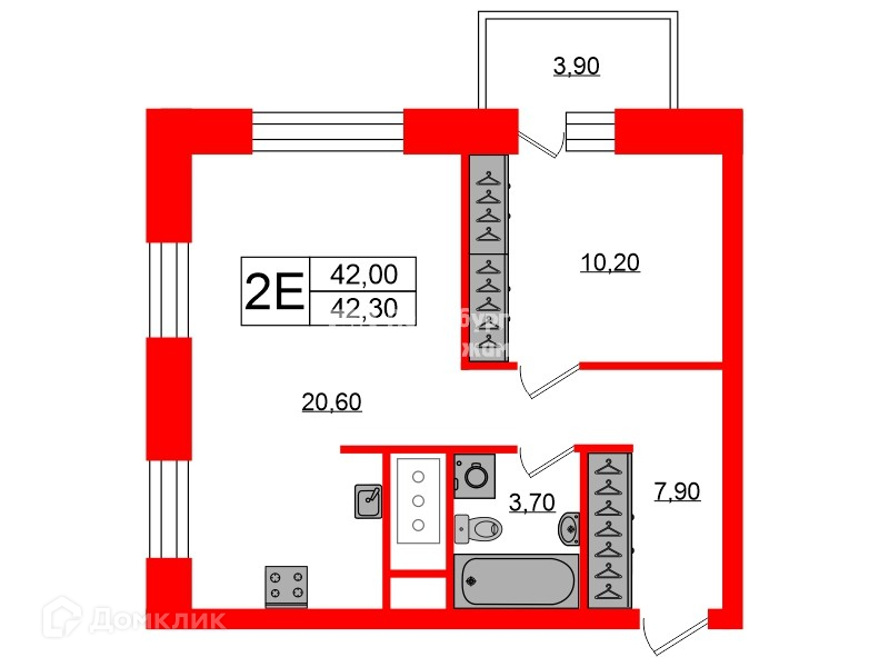 Общая площадь 42.3 м2