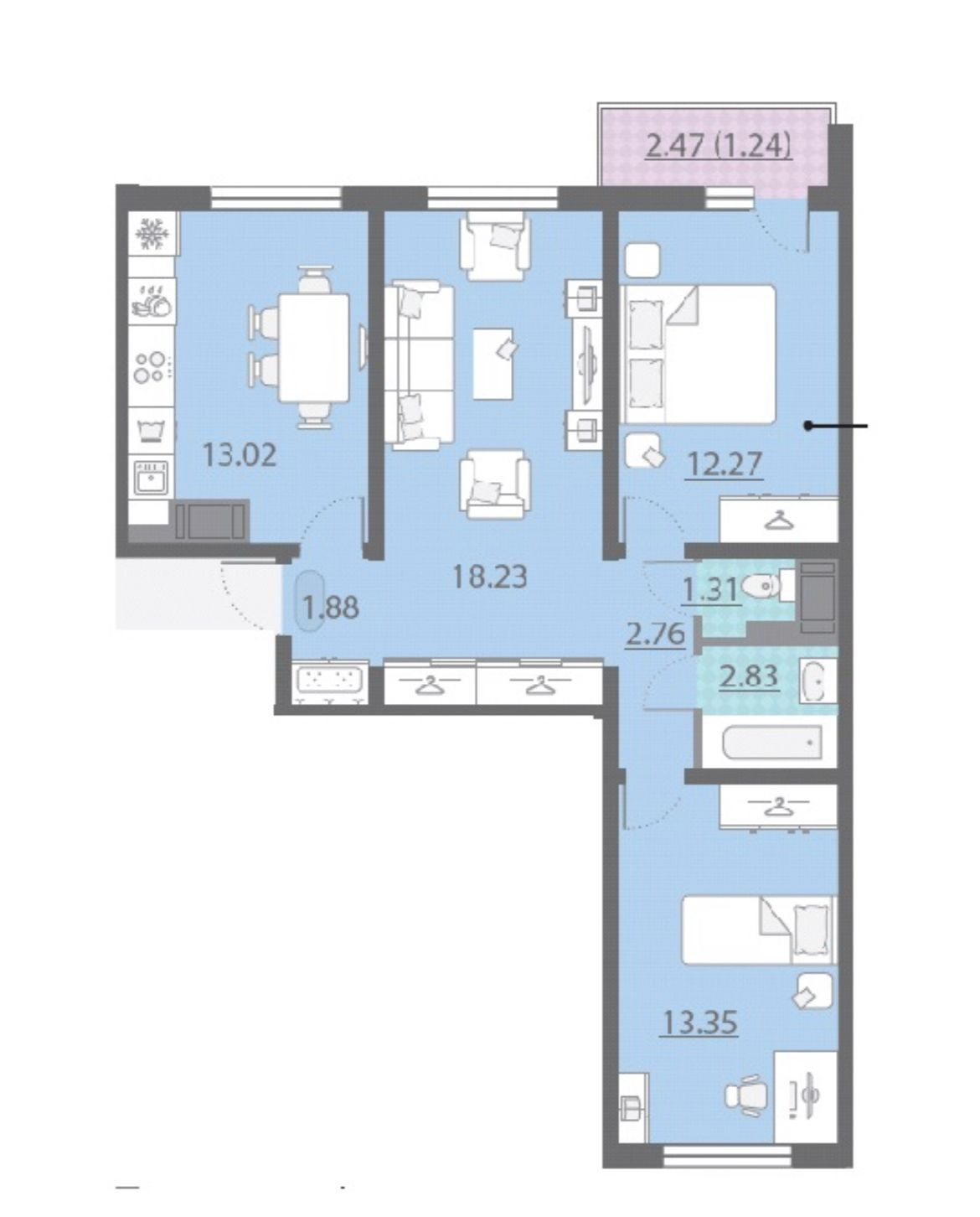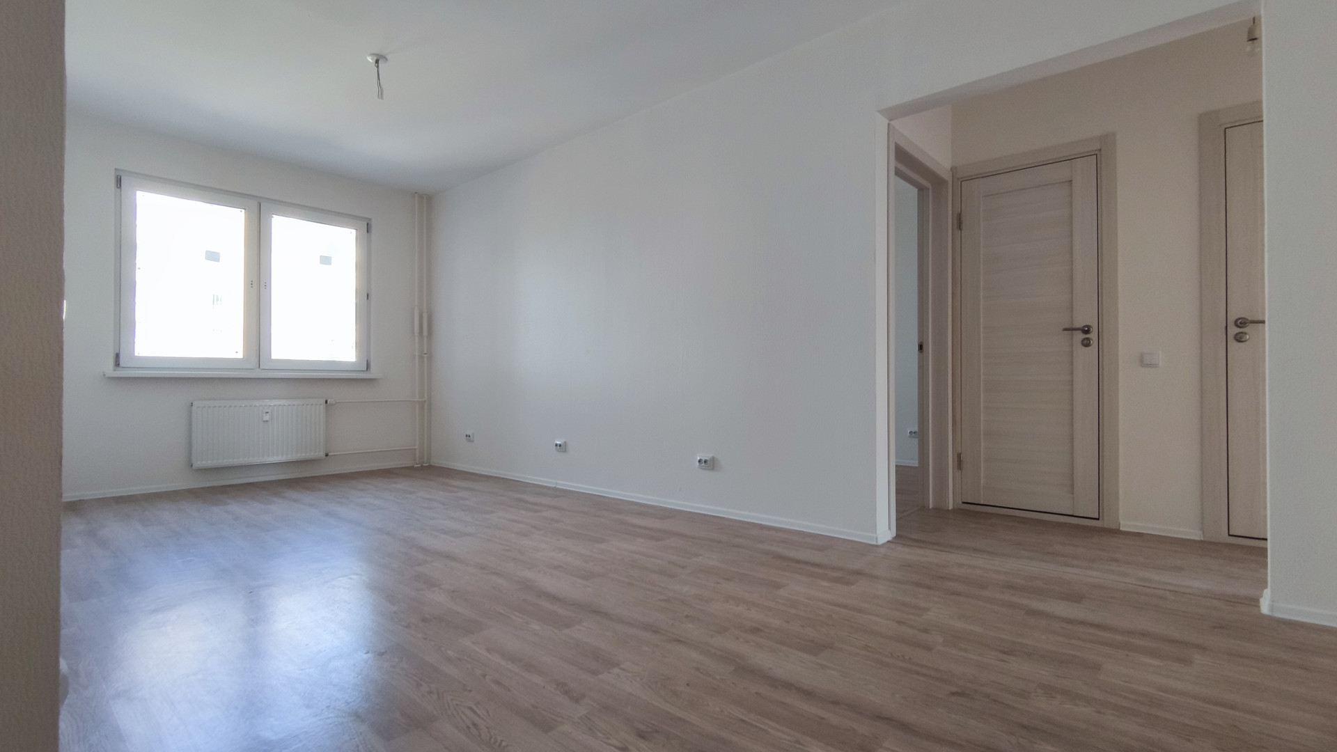 Квартира современной планировки. Кухня, 2 изолированные комнаты. Открытая гостиная расширяет пространство.