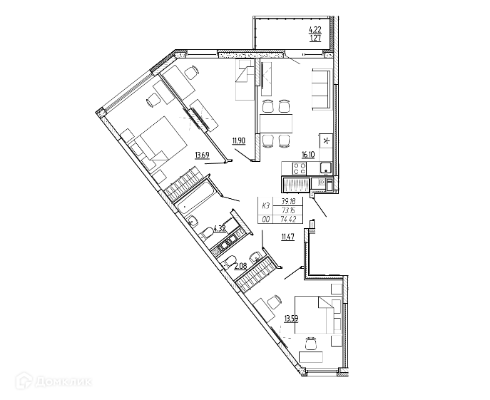 3-комнатная квартира, 77 м2, этаж 10 / 16, на продажу в Санкт-Петербурге, улица Беринга, 23к2