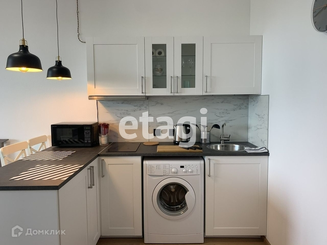 Полностью оснащенная кухня с индукционной варочный панелью, плитой свч и встроеным холодильником.