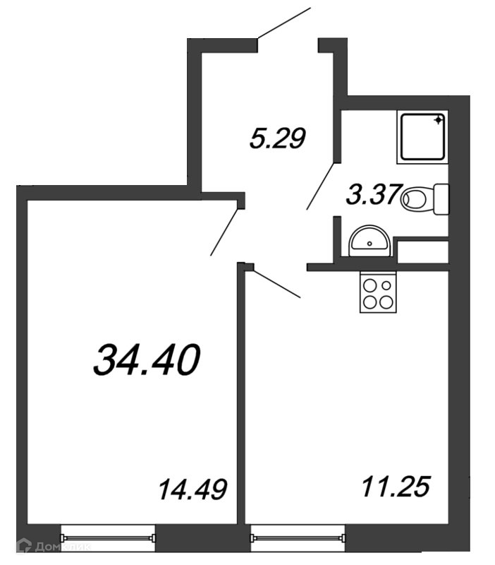 Общая площадь 34.4 м2