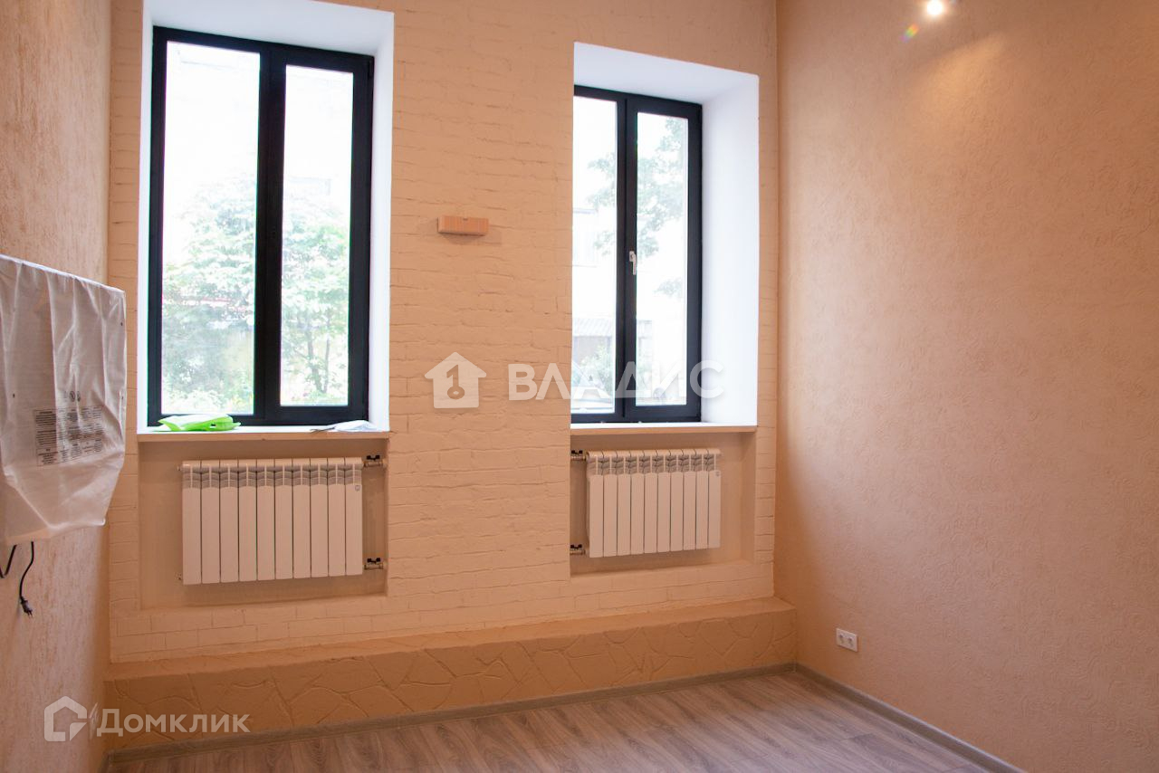 площадь по полу - 22.3 кв.м. 2 Высоких окна покрыты отражающей пленкой.