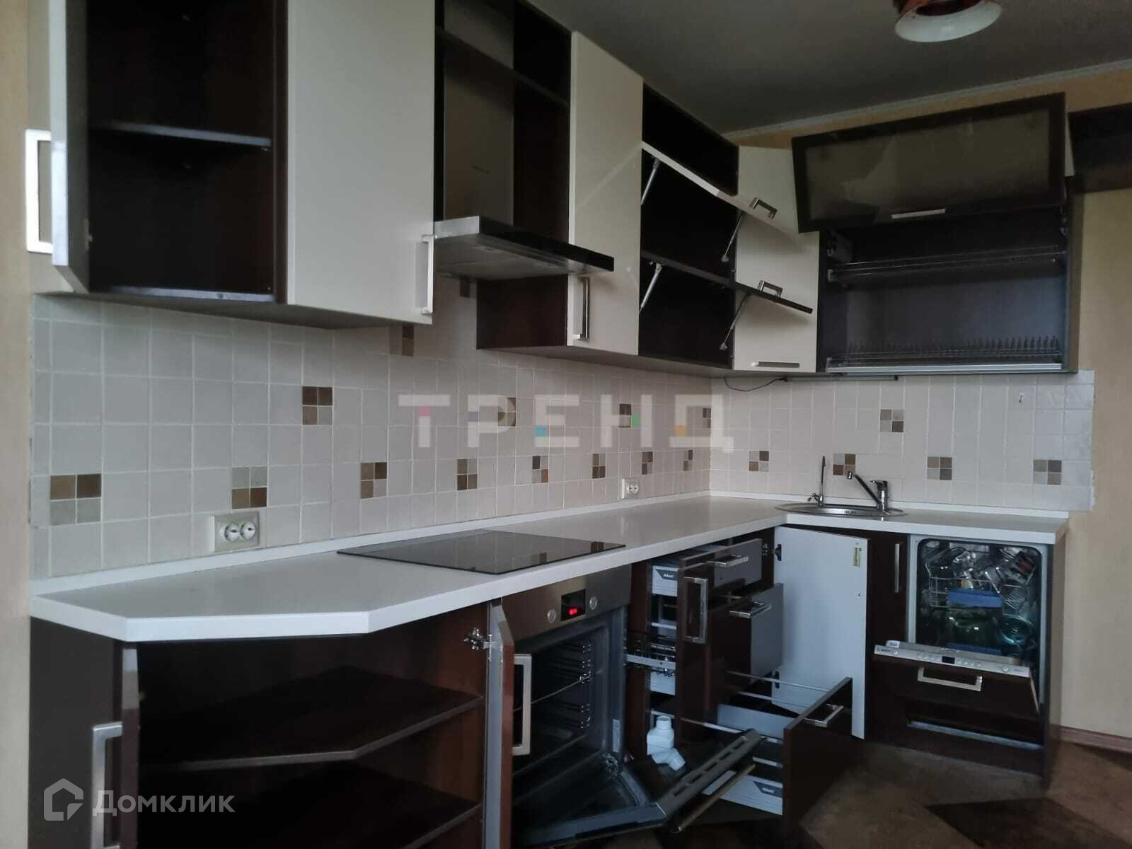 На кухне вы найдете индукционную плиту, духовой шкаф, вытяжку и посудомоечную машину, что обеспечит комфорт и удобство при приготовлении пищи.