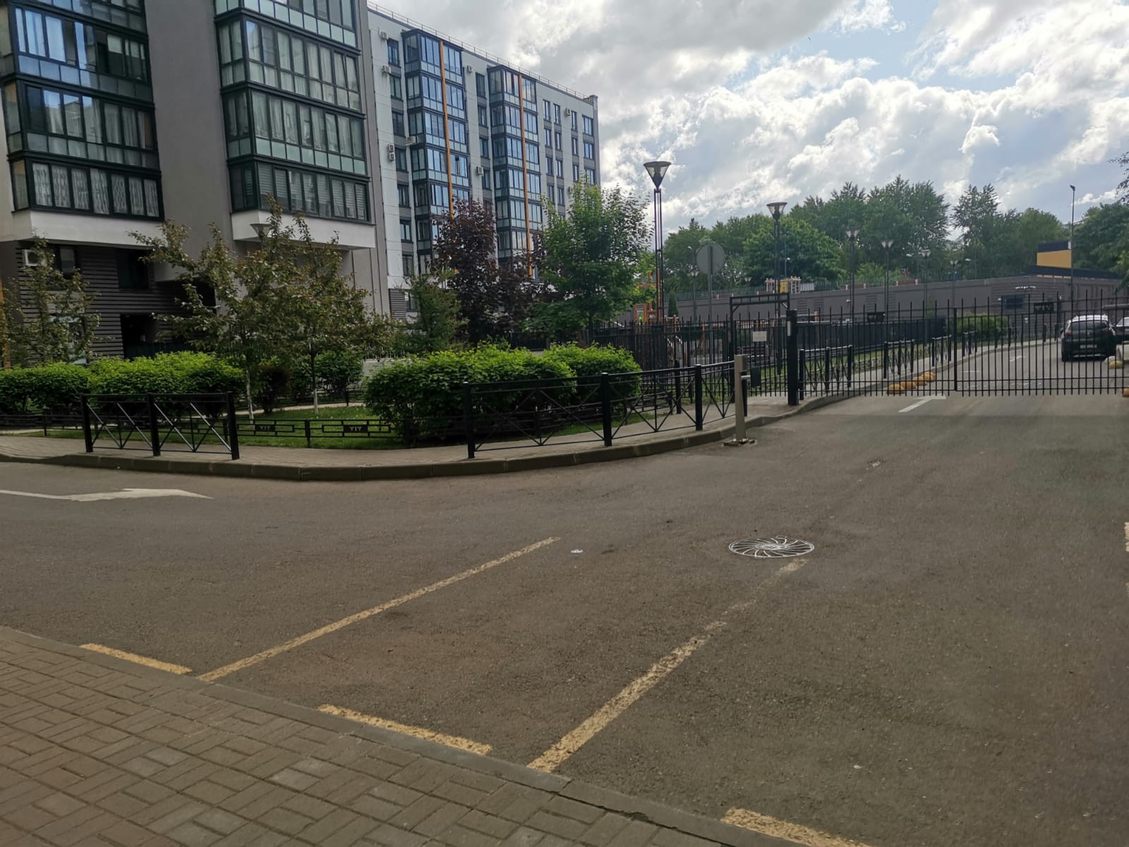 Благоустроенный двор с детскими и спортивными площадками, двор без машин.