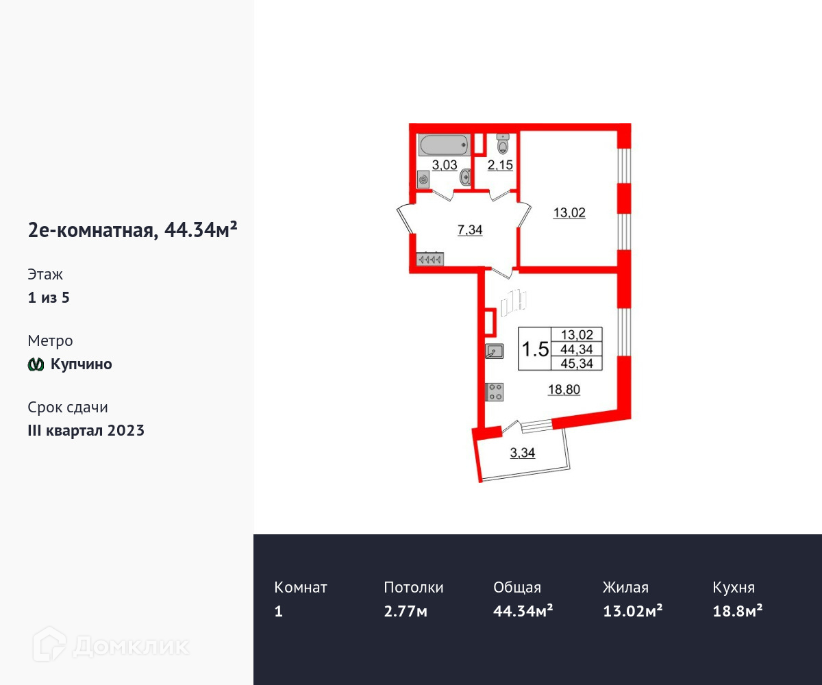 Продается однокомнатная квартира в ЖК Зеленый квартал на Пулковских высотах площадью 43.3 м2 (жилая площадь – 13.02 м2). Квартира расположена рядом с метро Московская. Расстояние до метро 20 Мин.на транспорте. Площадь кухни 18.8 м2. Площадь прихожей 7.34 м2. Высота потолка 2.77 м. Балкон. Чистовая отделка.