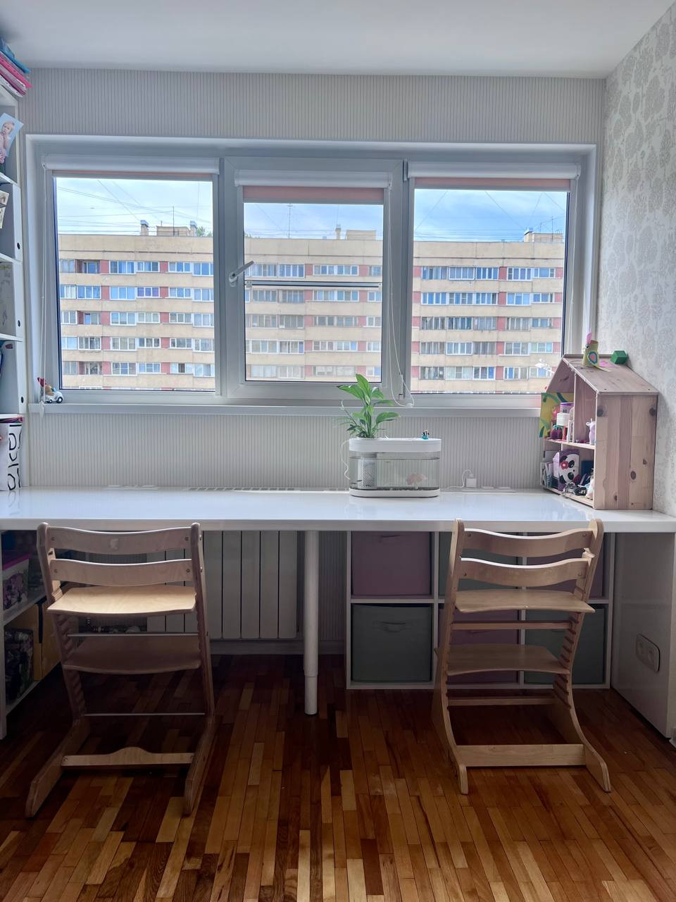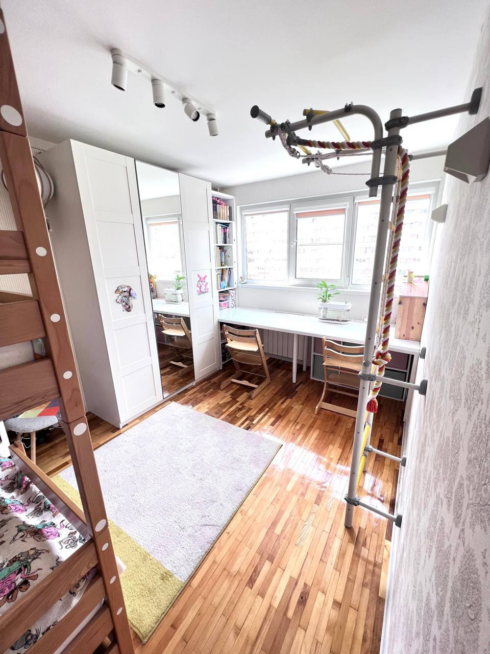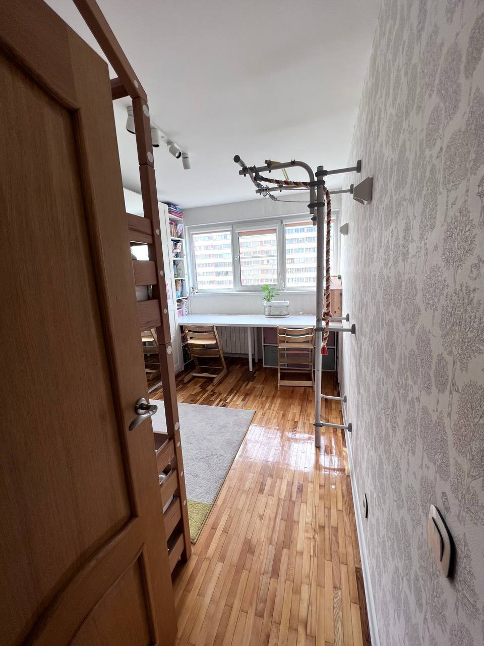 Из мебели остается кухонный гарнитур со встроенной техникой, а также встроенный письменный стол на ширину комнаты с книжным шкафом.