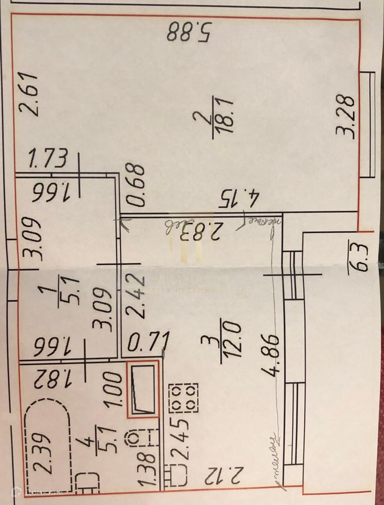 *Кухня 12м. удобно расположена, есть возможность зонирования.