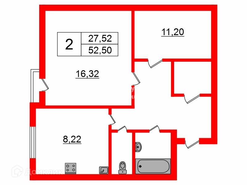 Общая площадь 52.5 м2