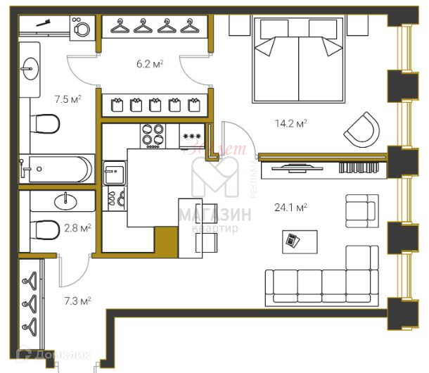 - Мастер-спальня  - 14.2 м2 + Ванная комната  7.5м2  + гардероб - 6.2 м2
