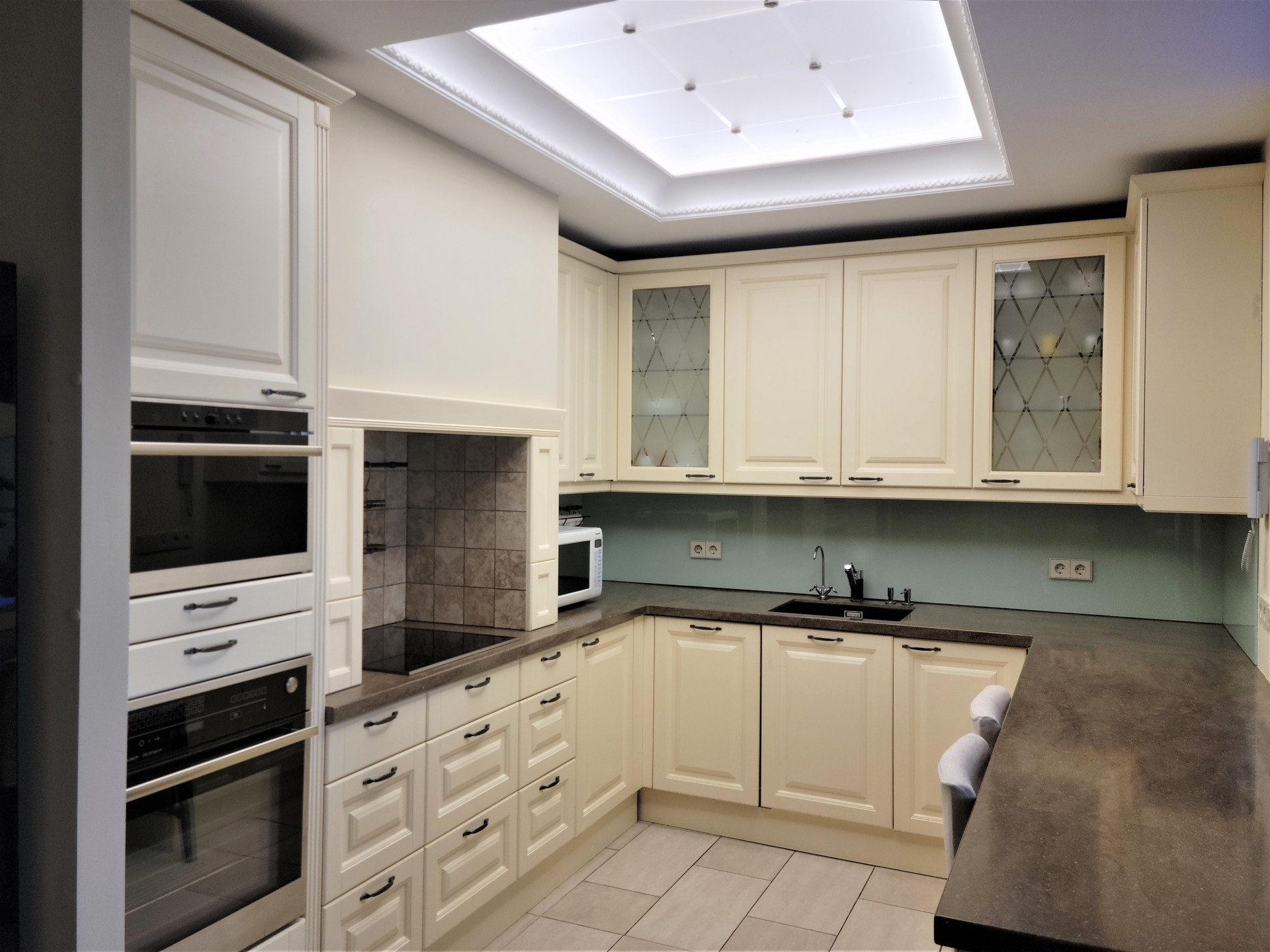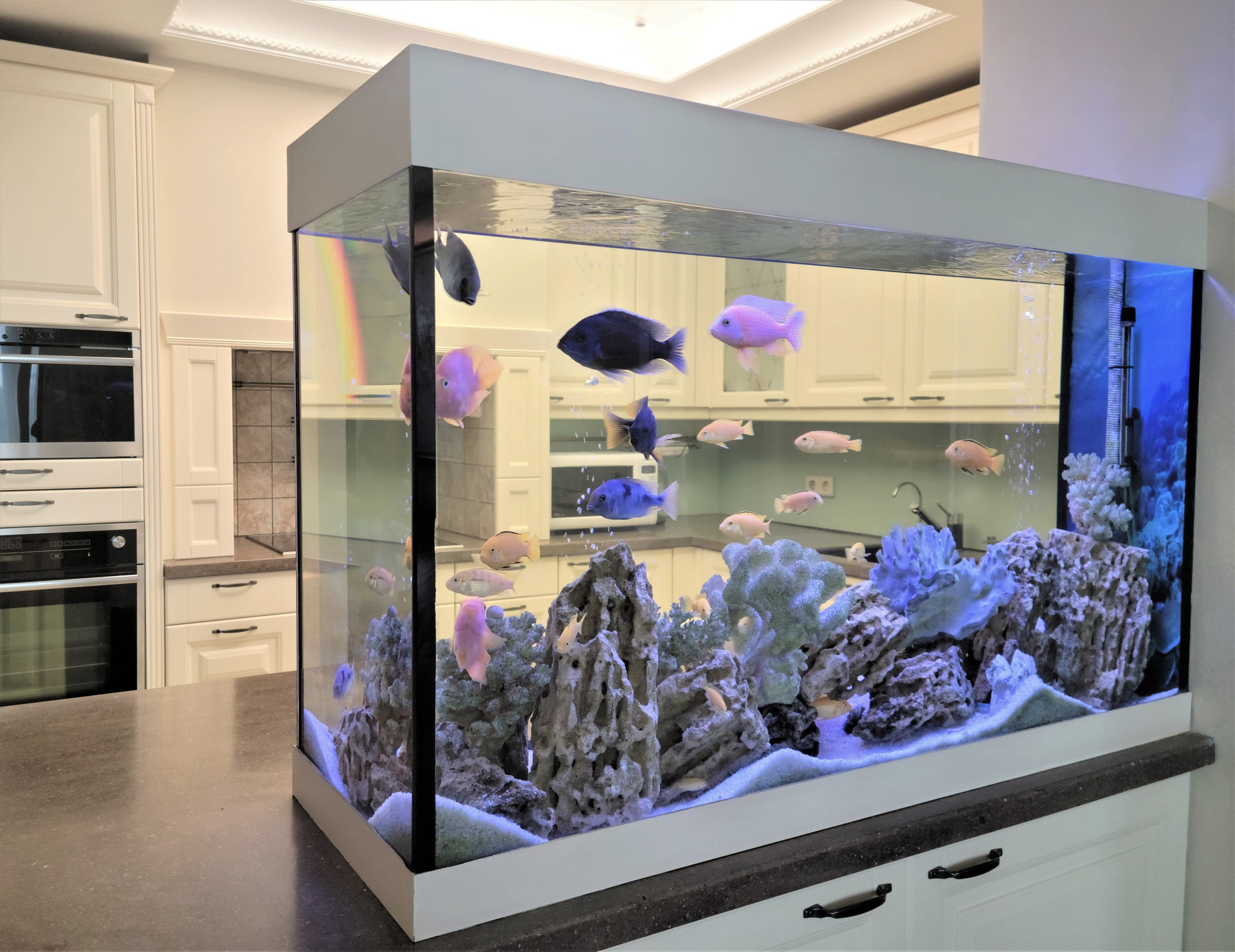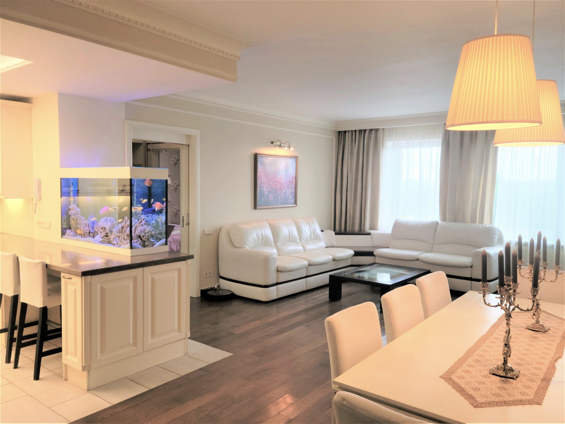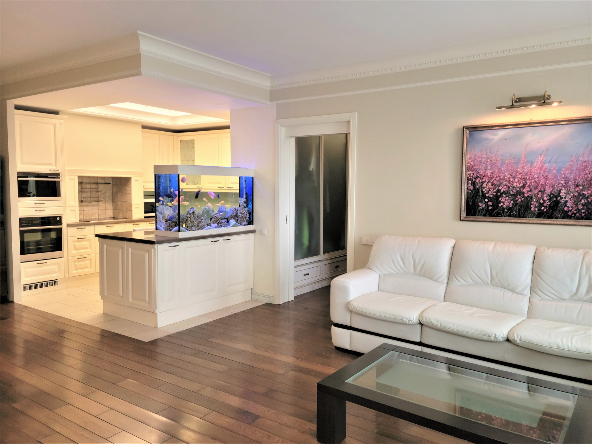 Большая кухня-гостиная с пресноводным аквариумом, две спальни, два санузла с душевыми кабинами и ванной, оборудован удобный рабочий кабинет-гардеробная. Высота потолков 3 метра.